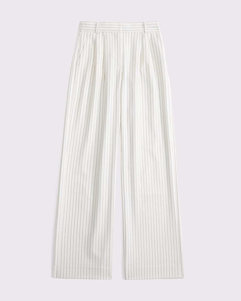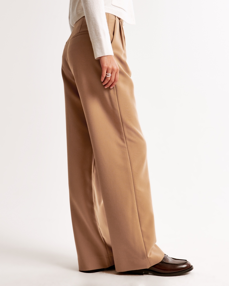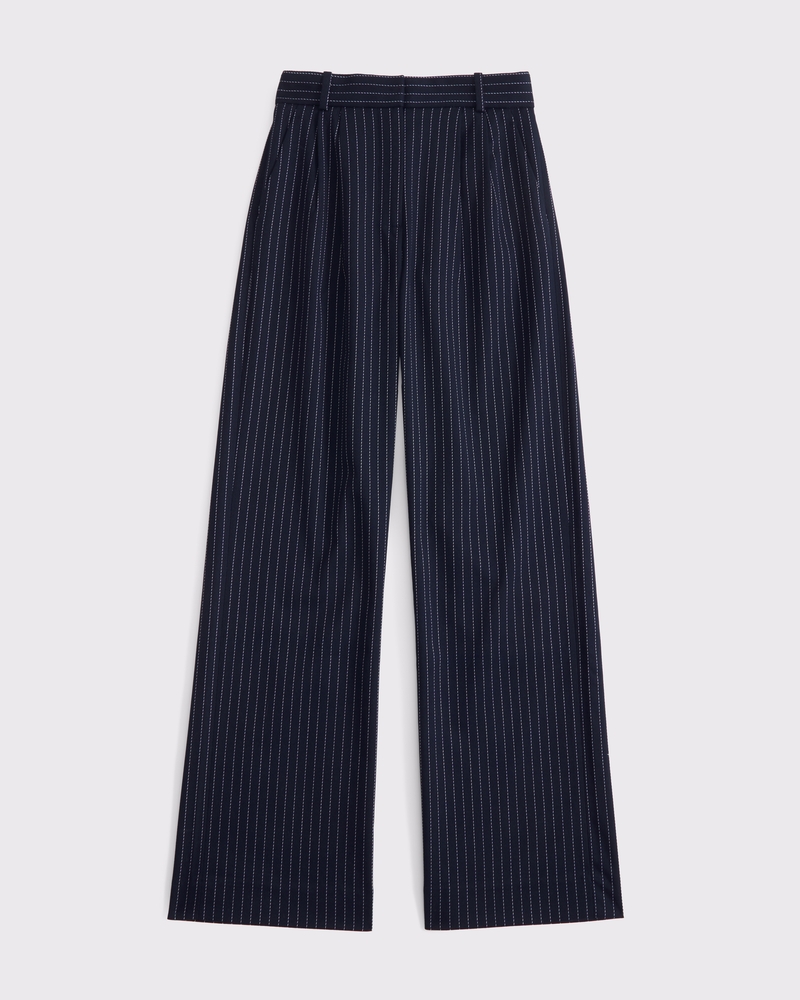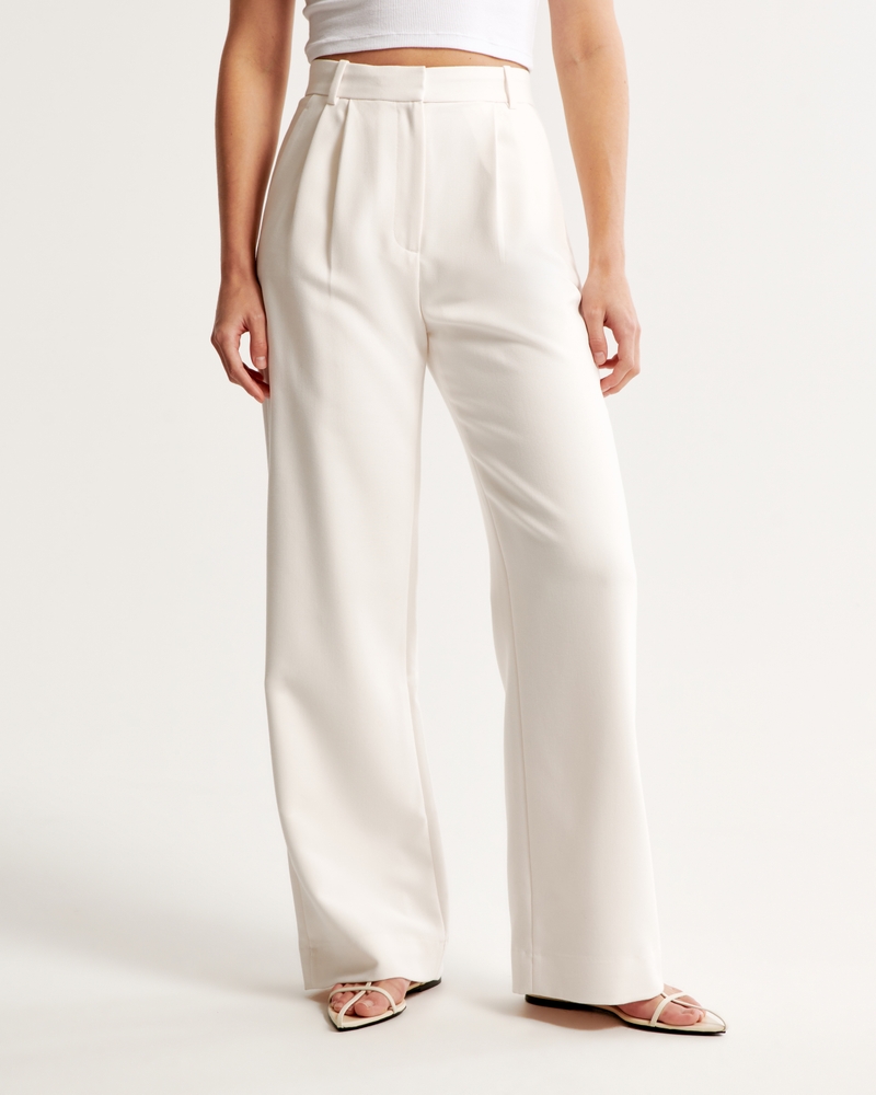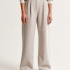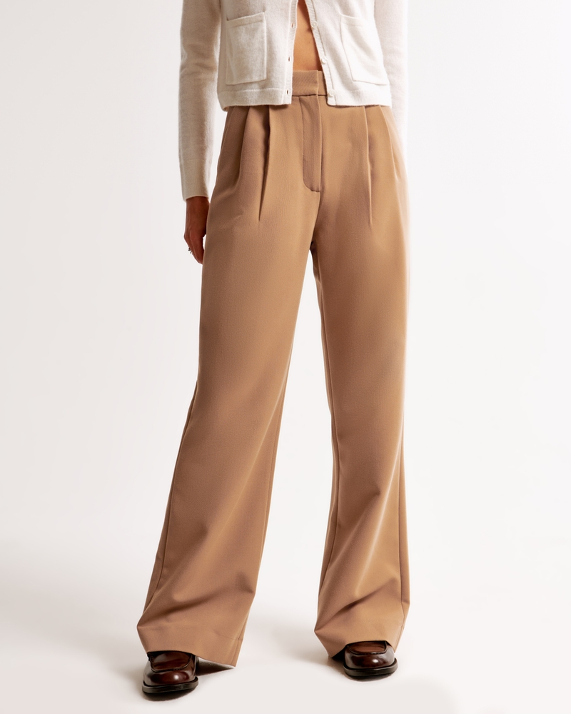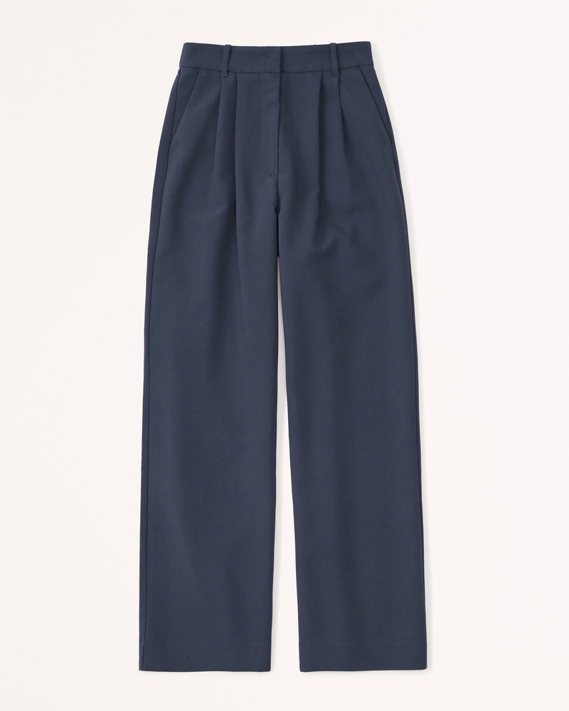 Our signature A&F Sloane tailored pant in our everyday menswear fabric. The Sloane Tailored Pant is an ultra high rise tailored wide leg pant with figure-flattering pleat details, a functional fly and a partially elasticated waistband for ultimate adjustability. This fit is relaxed through the hips, and eases into a wide, full-length leg shape. The body of this garment contains 66% recycled polyester. Imported.