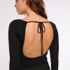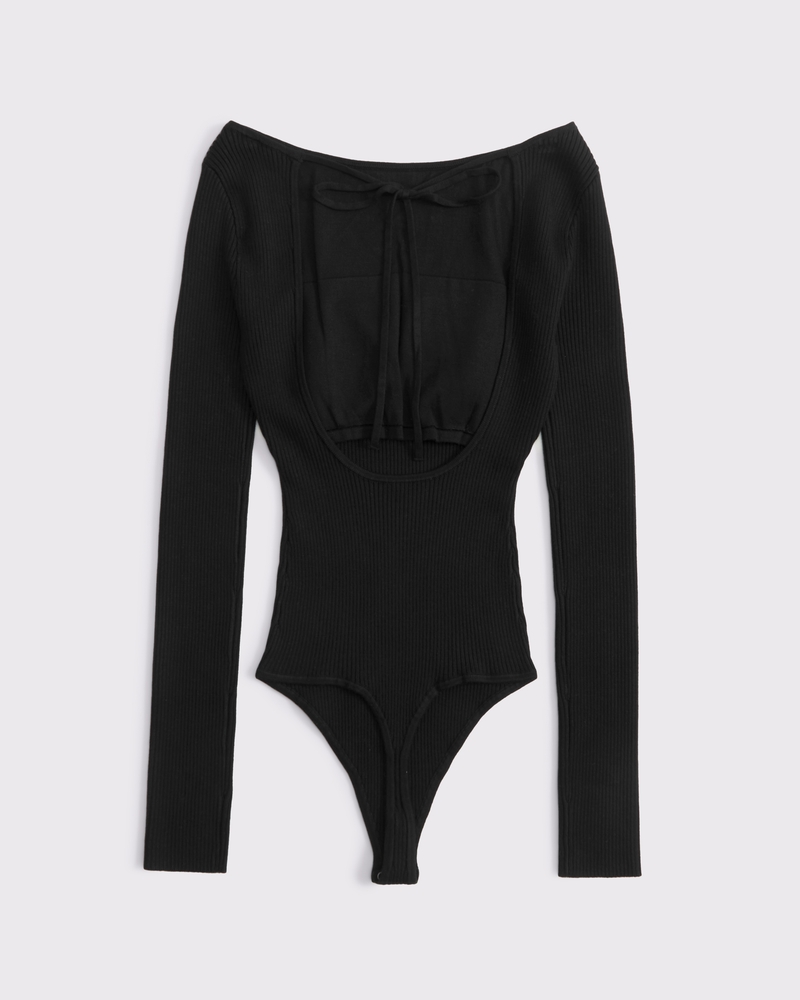 Slim-fitting bodysuit in our sculpting sweater-knit fabric, featuring an open-back detail with tie closure, shelf bra with removable pads, ribbed stitching details throughout and two-snap bottom closure. Pairs perfect with your favorite mini skirt for a night out!