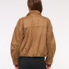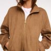 On-trend bomber jacket in our soft vegan suede fabric, featuring a cinching detail at the waist, zip-up front, mock neckline and side entry pockets. Imported.