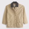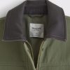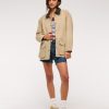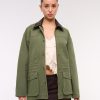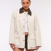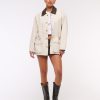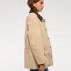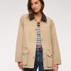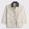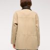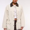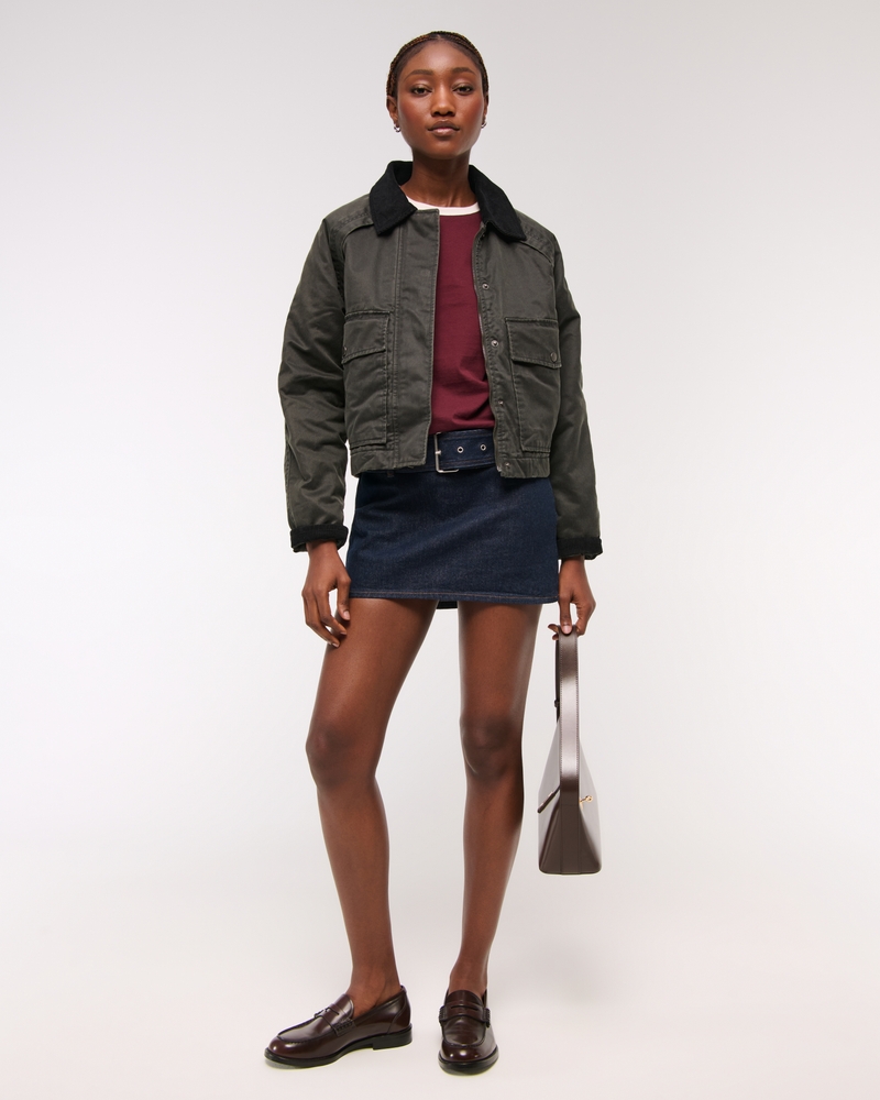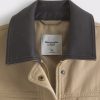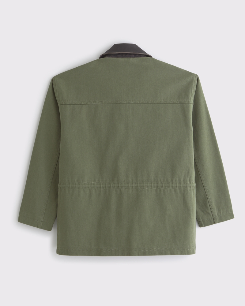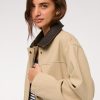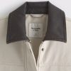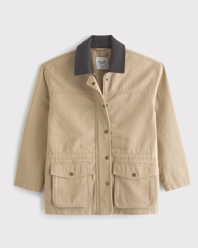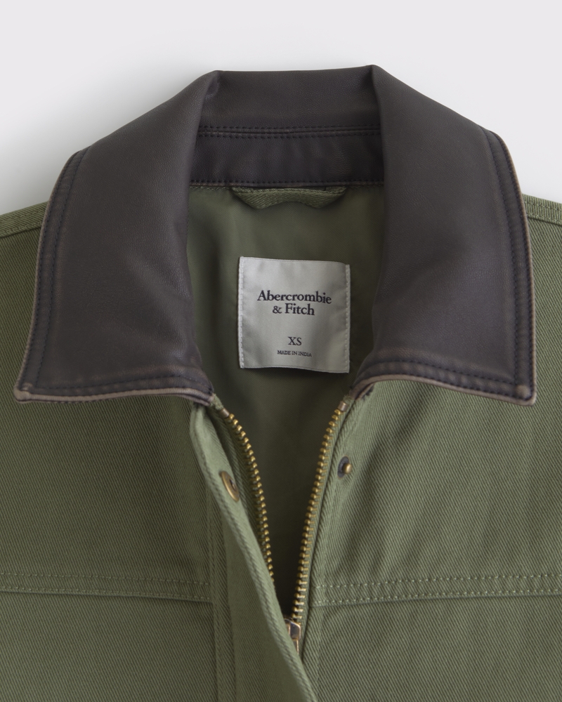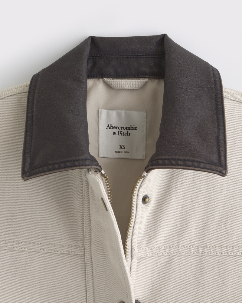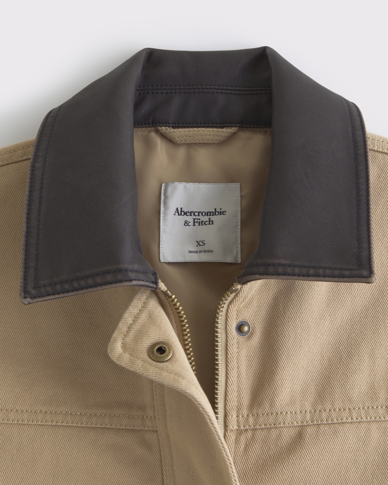 Our new workwear-style jacket in a comfortable twill fabric, featuring a cinching detail at the waist, a vegan leather fold-down collar, front pockets, and a zip- and snap-up front. Imported.