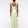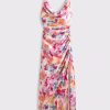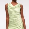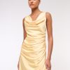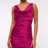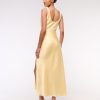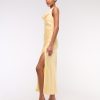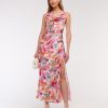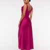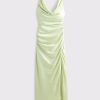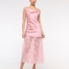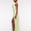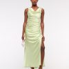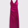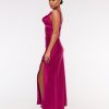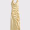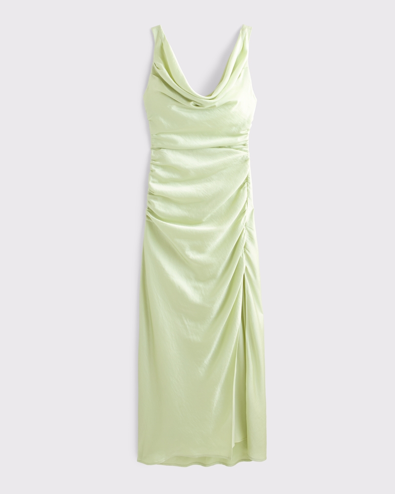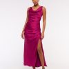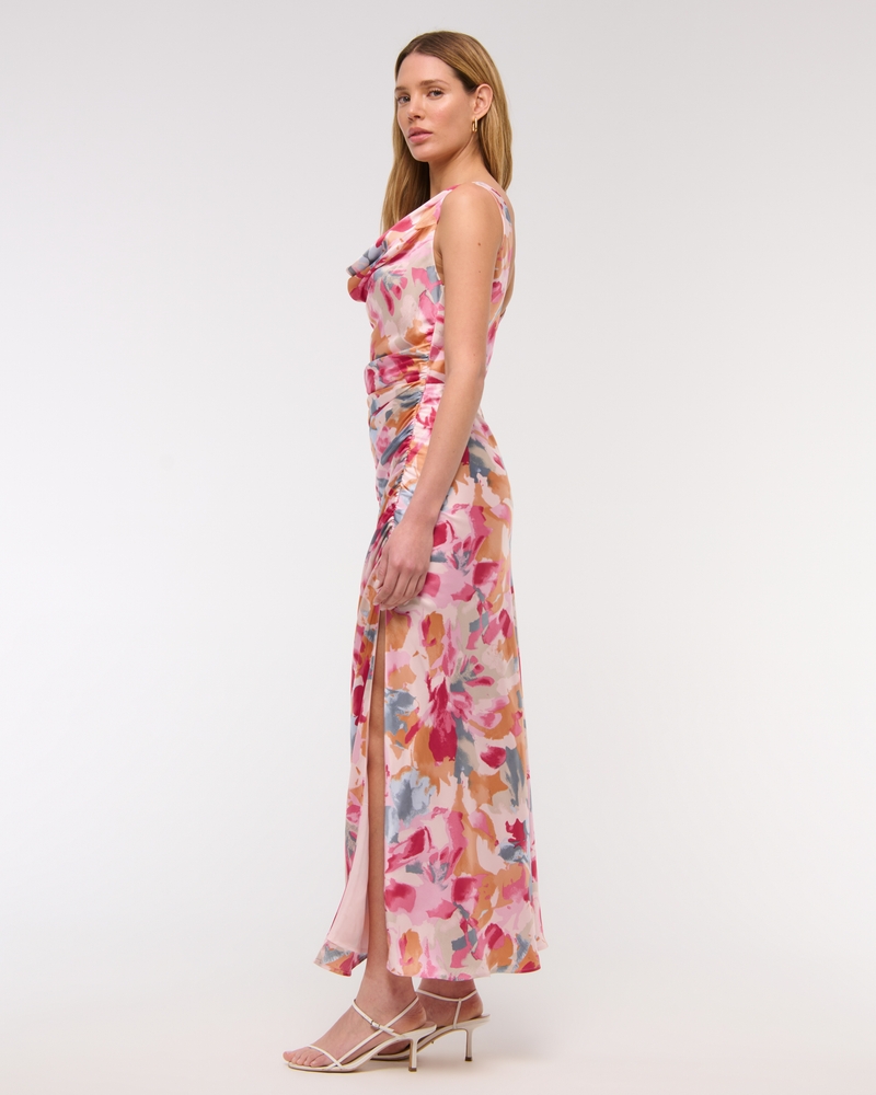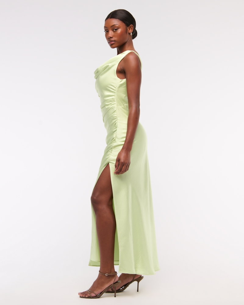 Flattering maxi dress in our textured satin fabric, featuring a cowl neckline, draping details across the bodice and a thigh-high slit detail. Imported.