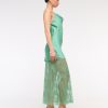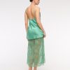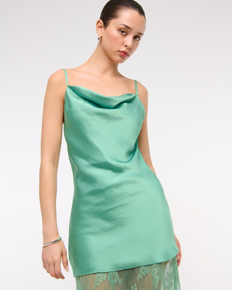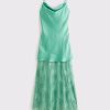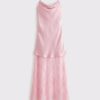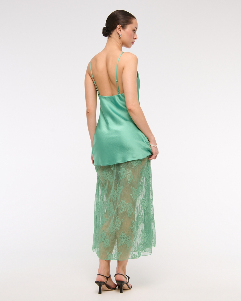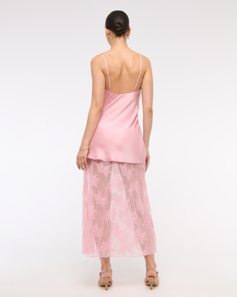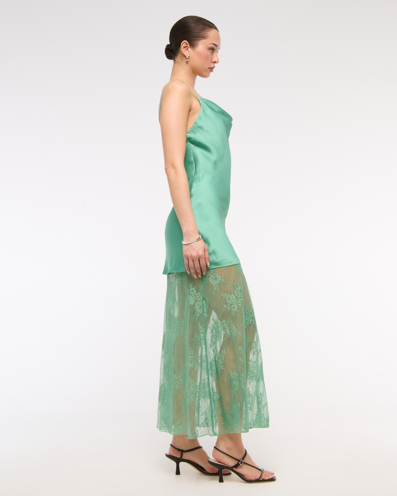 Flattering maxi dress in our textured satin fabric, featuring a flowy lace skirt, adjustable straps and draped cowl neckline.