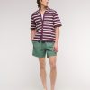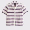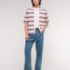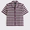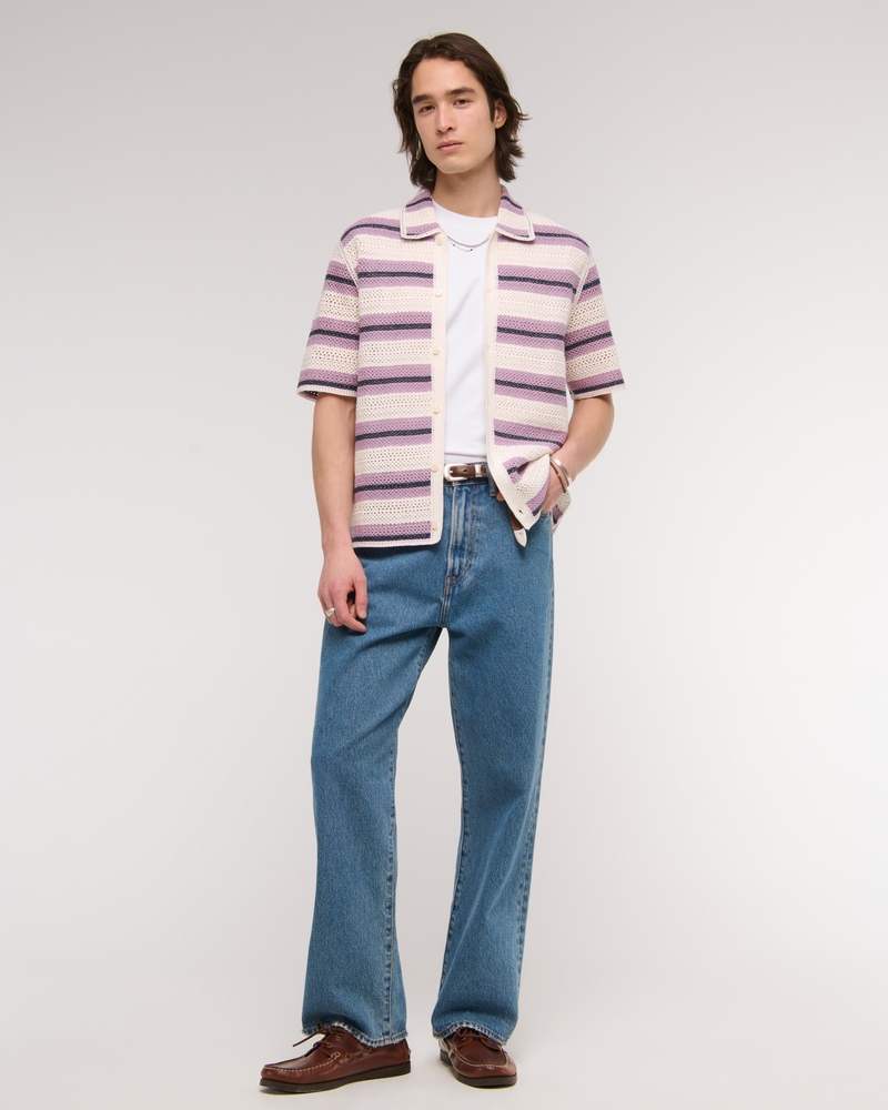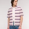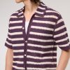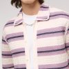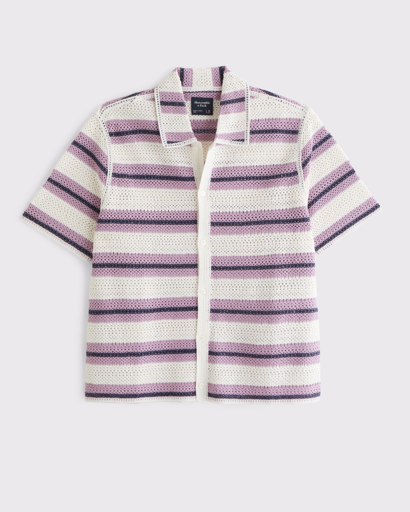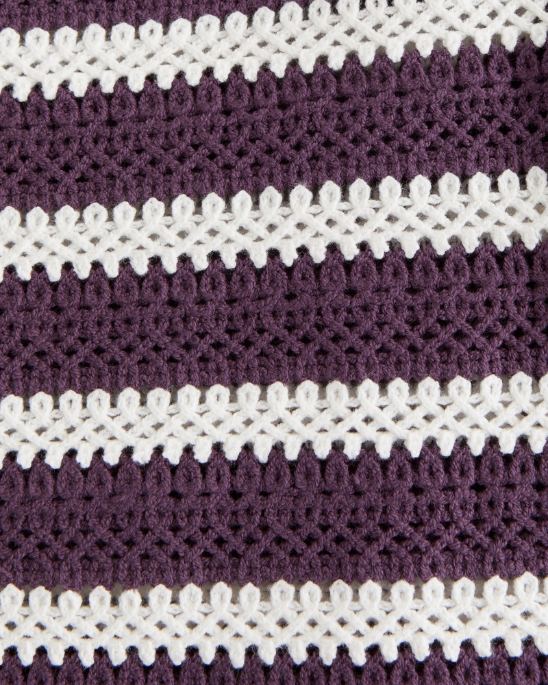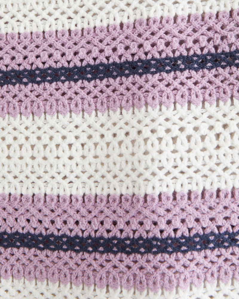 Comfortable sweater polo in a soft sweater-knit fabric and slightly boxy, cropped silhouette, featuring crochet-style stitching details throughout, button-up front, classic collar, on-trend striped pattern and banded hem and cuffs. Imported.