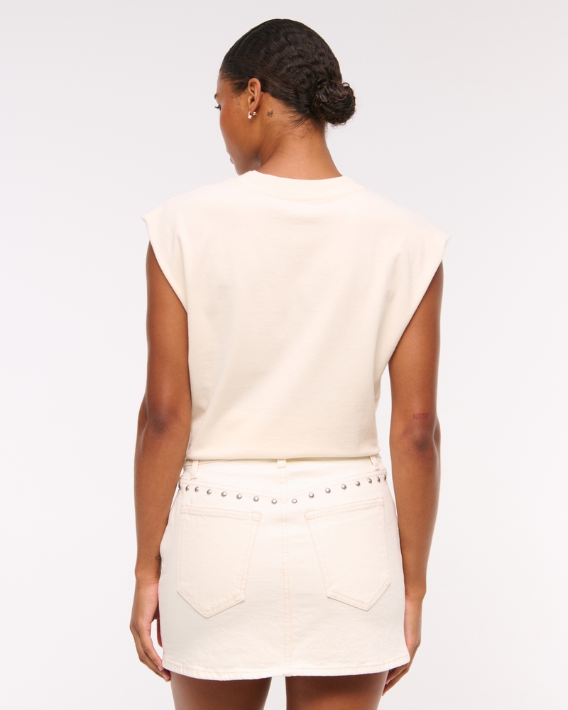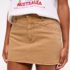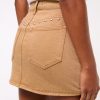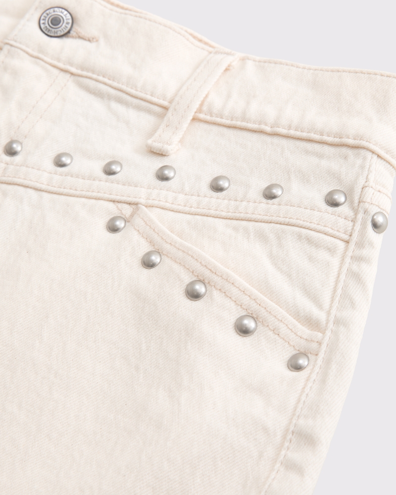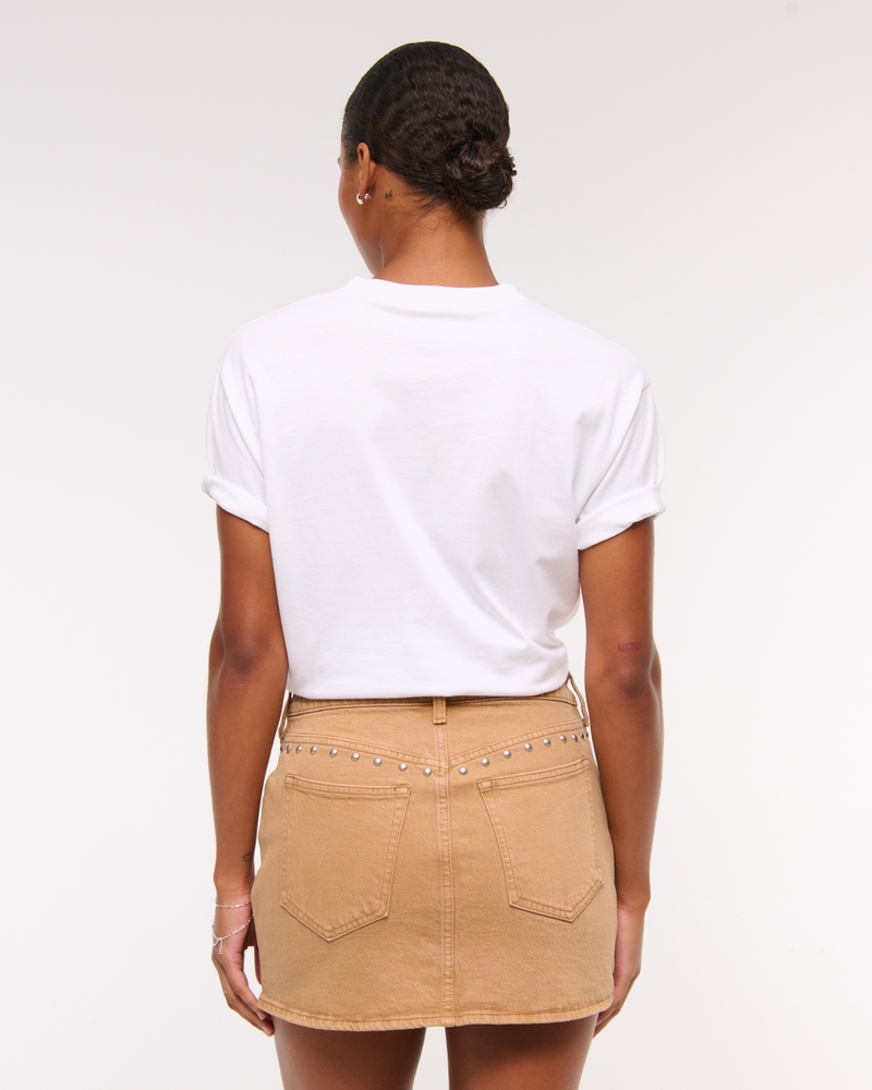 Our classic mid rise denim mini skirt in our soft lightweight rigid denim fabric, featuring on-trend studded details, a dropped waist and front J-stitch zipper for a secure fit. The viral fit that eliminates waist gap: Curve Love features additional room through the hip and thigh for curve-hugging comfort.