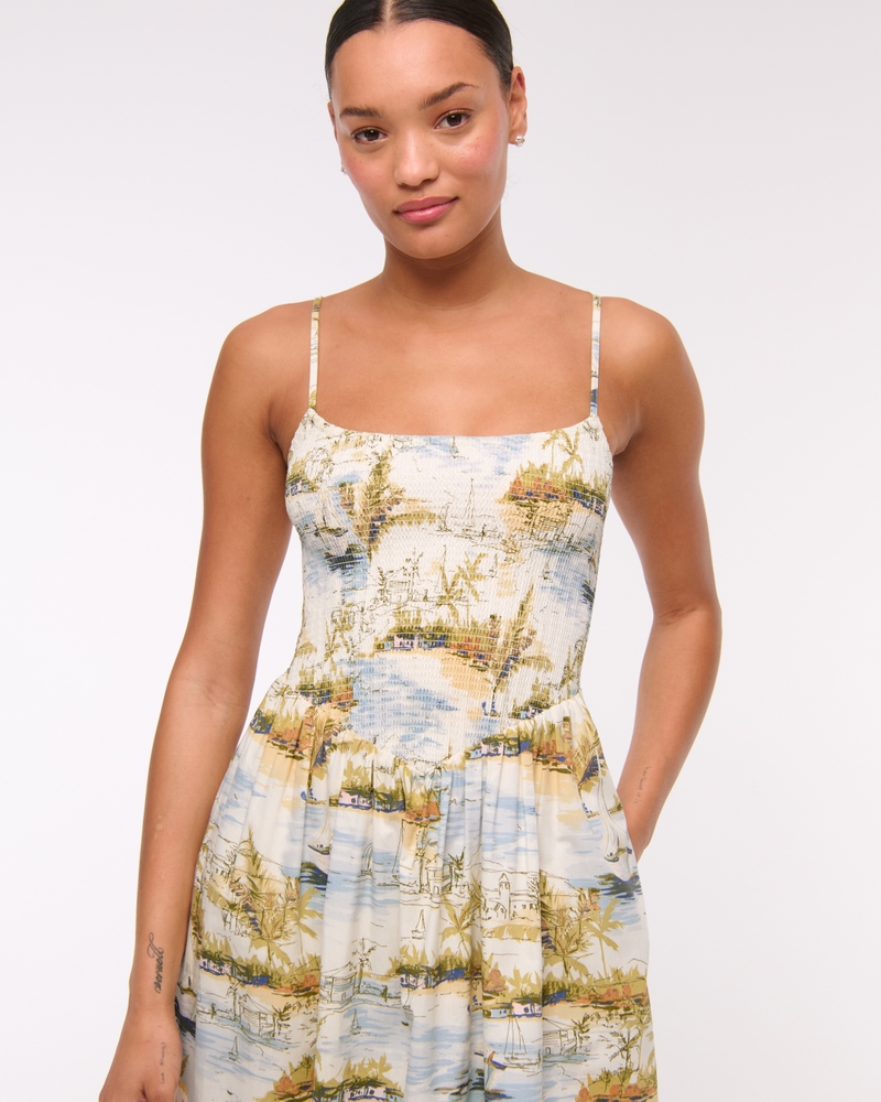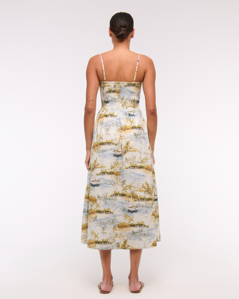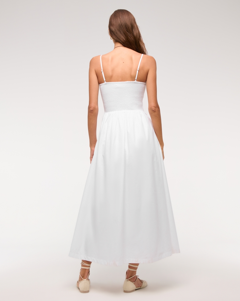 Flattering midi dress in our soft poplin fabric, featuring smocking details along the bodice, adjustable straps, scoop neckline and a flowy skirt. Imported.