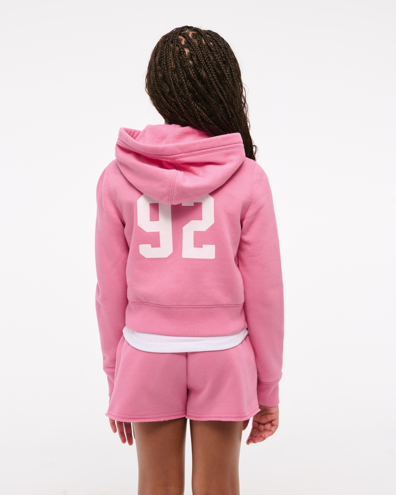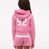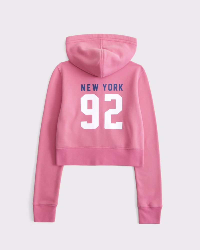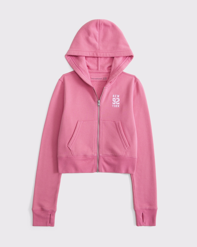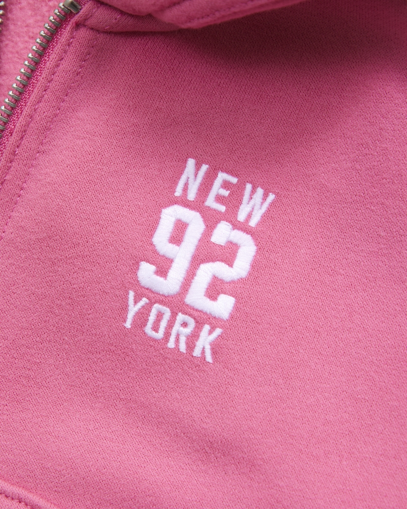 Our new full-zip hoodie in a soft fleece fabric and cropped length, that hits above the hips, featuring embroidered graphic details at left chest and back, side pockets, banded hem and thumbholes at cuffs. Imported.