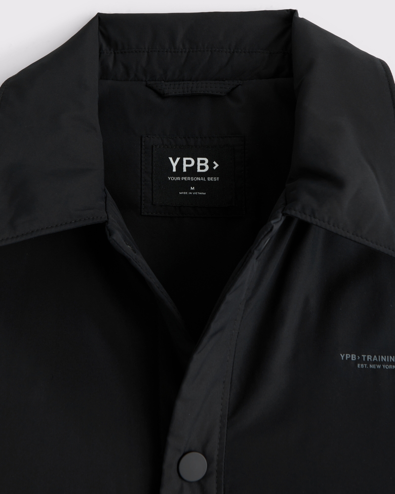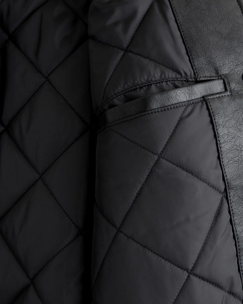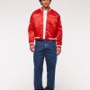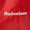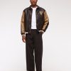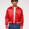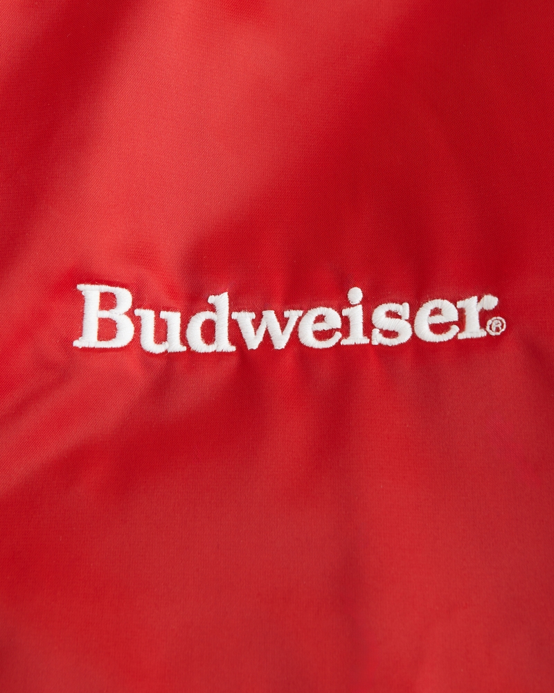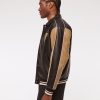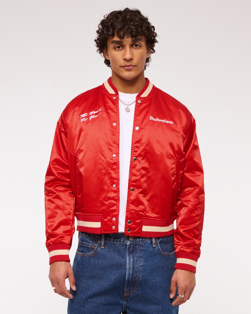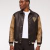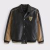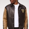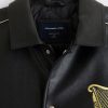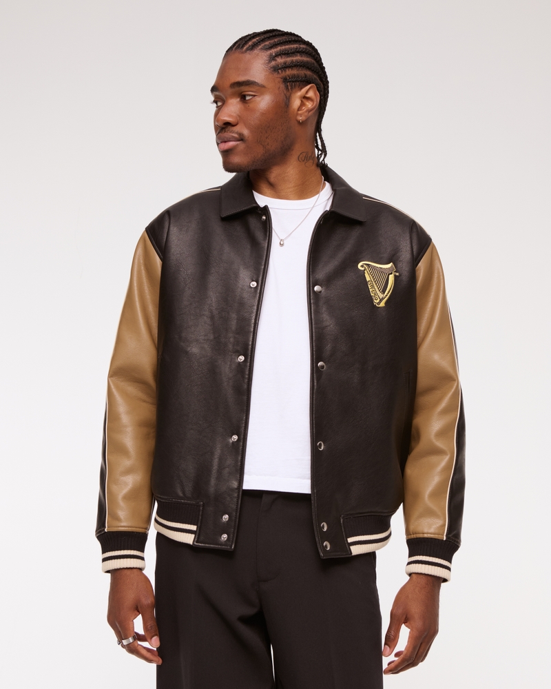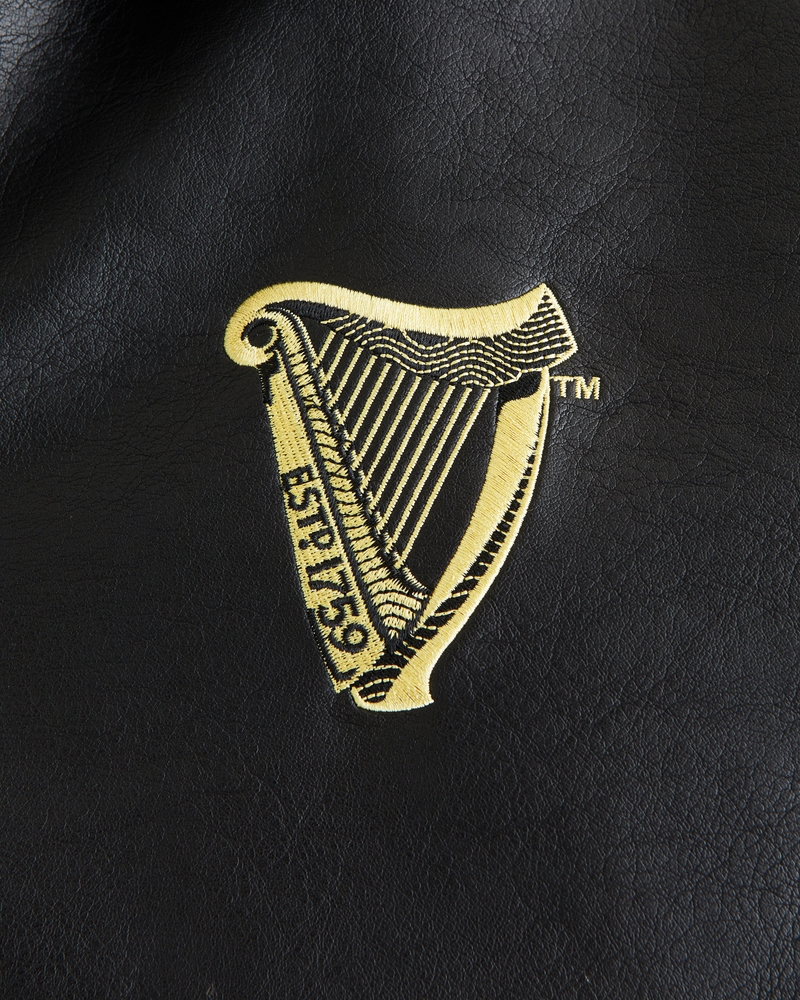 Classic bomber jacket in a soft vegan leather fabric and relaxed-fit silhouette, featuring Guinness varsity-inspired embroidered graphic patch details throughout, classic fold-down collar, side pockets, snap-up front and tipping details at elastic cuffs and waistband.