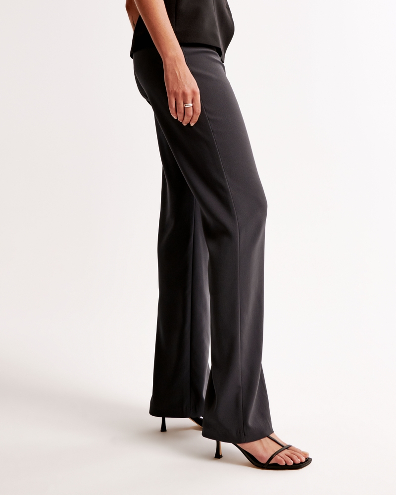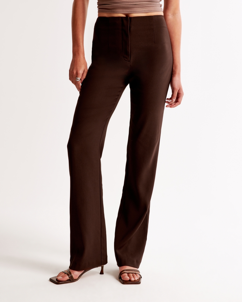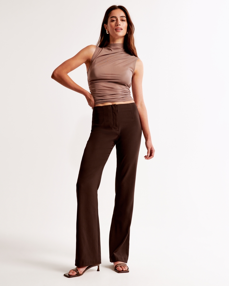 High rise pants, that are fitted at the waist and hips, slightly relaxed at the thigh and eases at the knee into a full-length boot leg shape, in our matte sculpt fabric, featuring a clean front waistband and a fly closure for a secure fit. Imported.