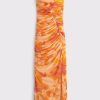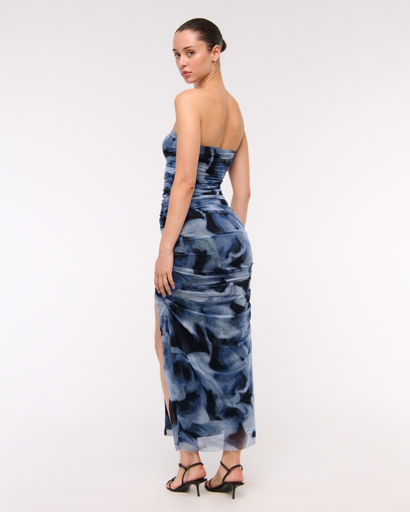 Flattering strapless longer-length maxi dress in our stretchy mesh fabric, featuring ruching details along the bodice and a thigh-high slit detail. Imported.
