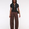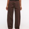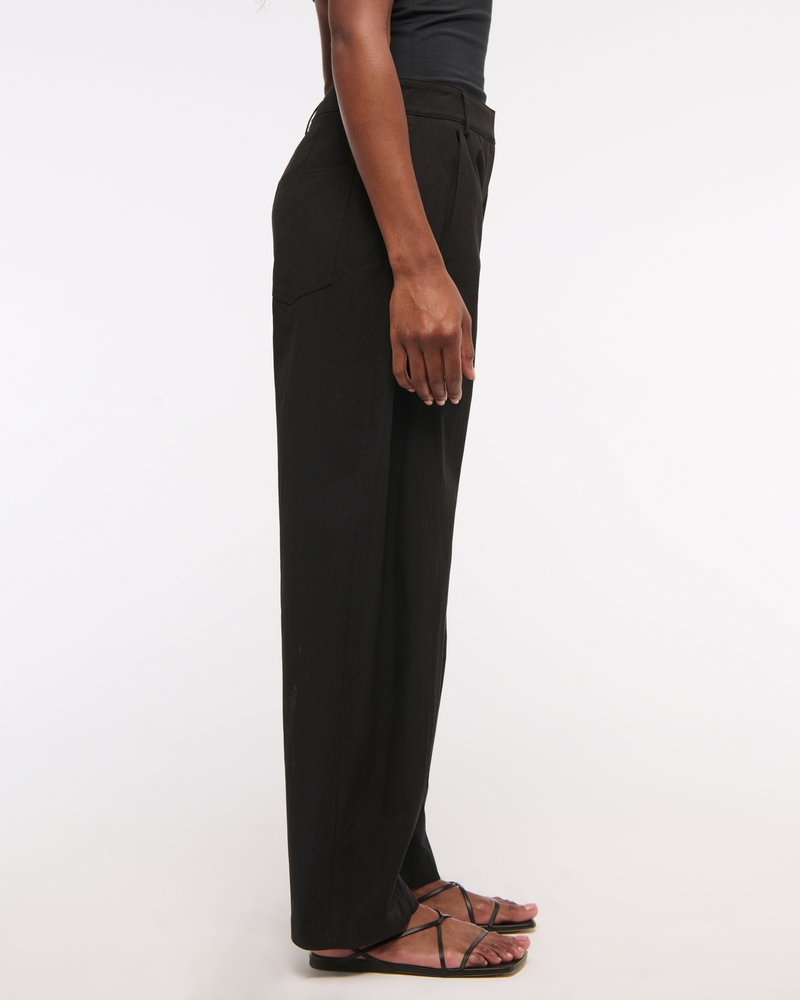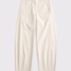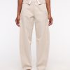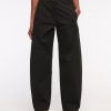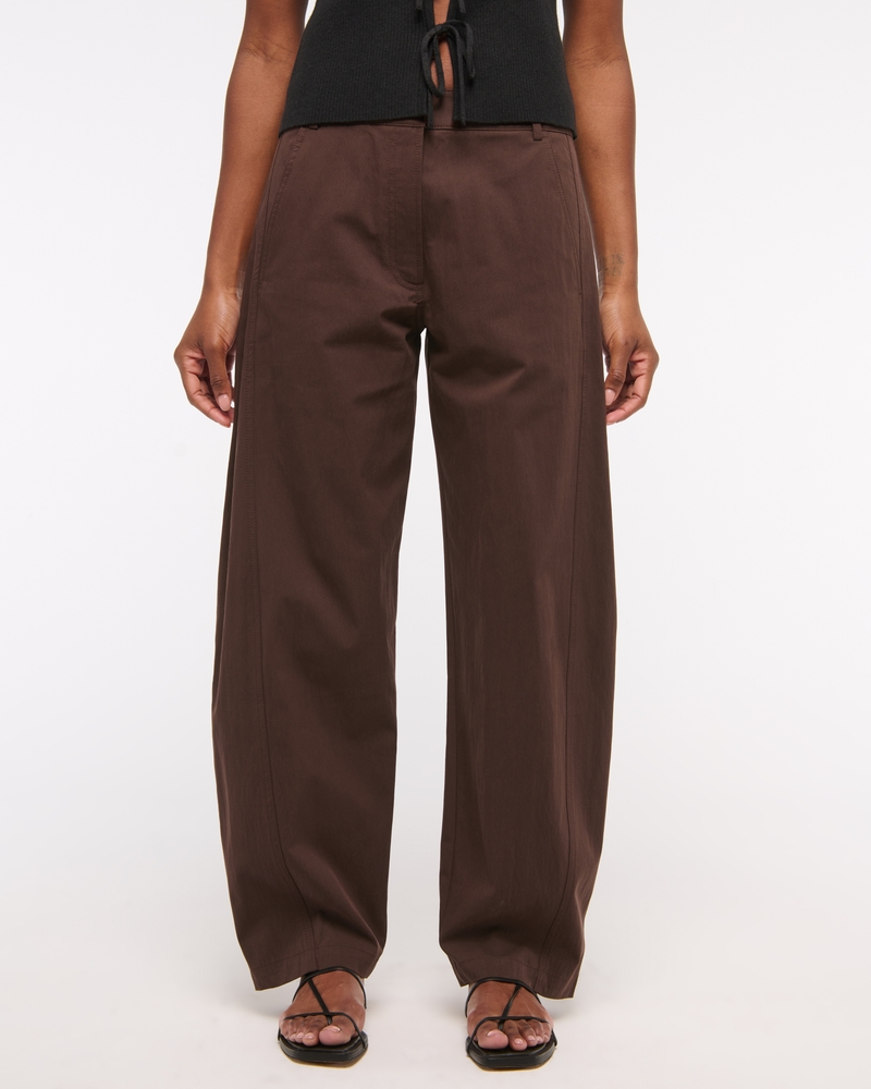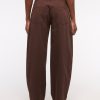 Mid rise pants, that have a relaxed fit at the waist and hips, loose fit through the thigh and calf, and tapers into a barrel-leg shape. Features functional pockets, belt loops and waistband closure. Imported.