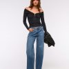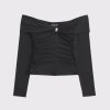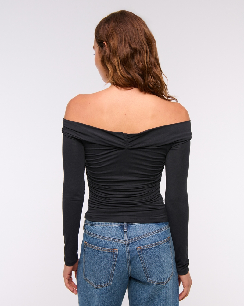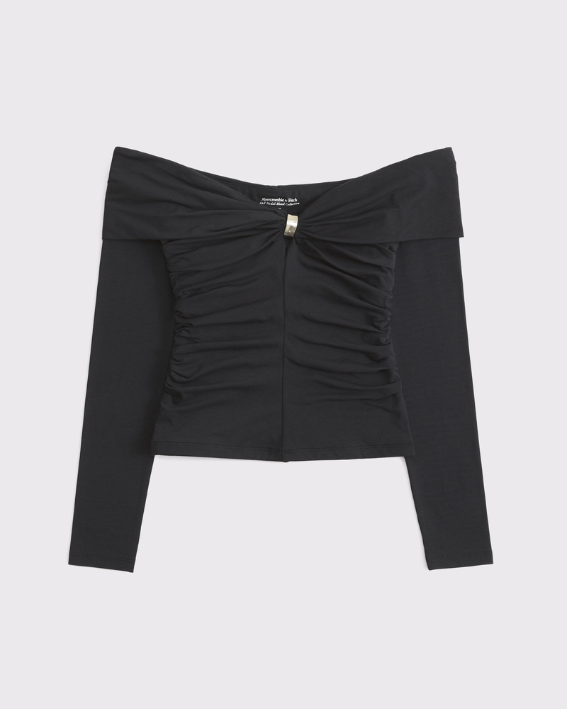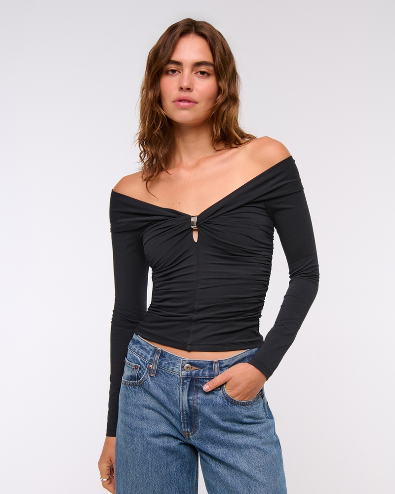 Slim-fitting long-sleeve top in our soft cotton-modal fabric, with an off-the-shoulder neckline, ruching details along the bodice and on-trend hardware detail. Imported.
