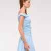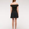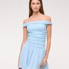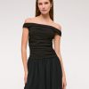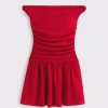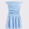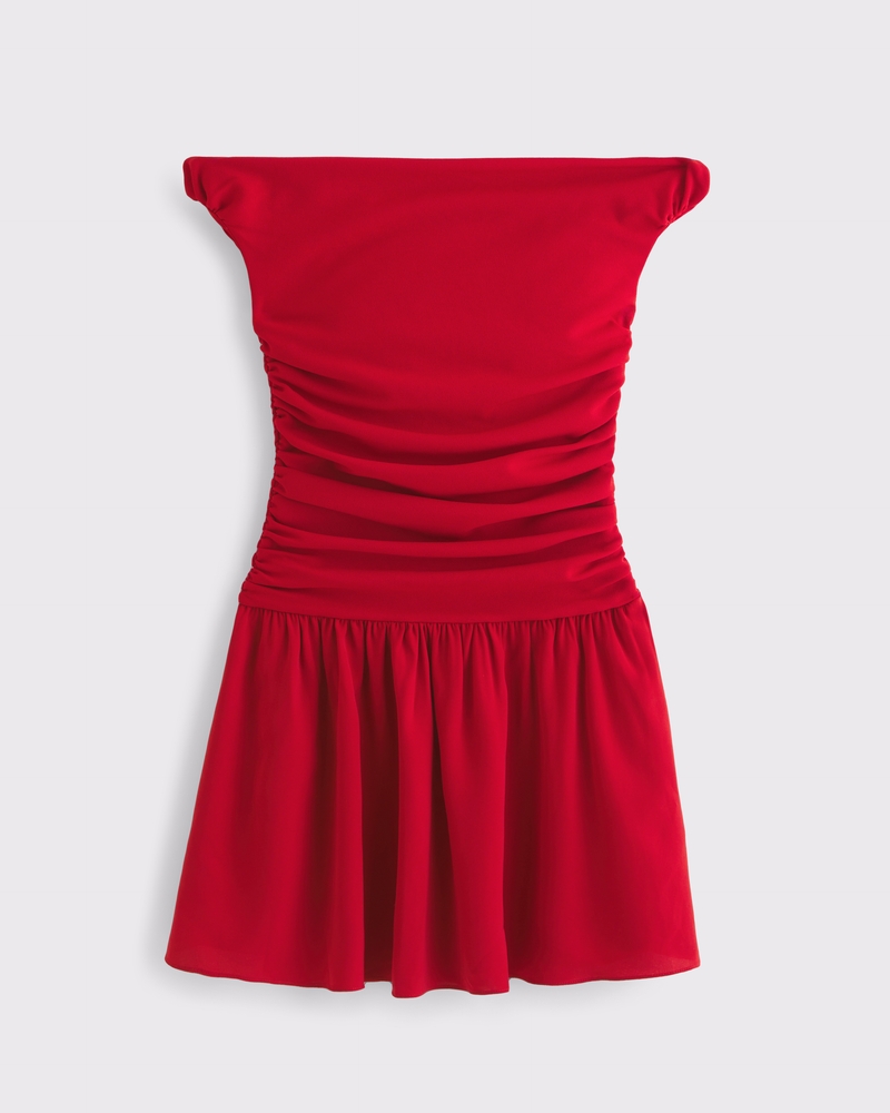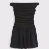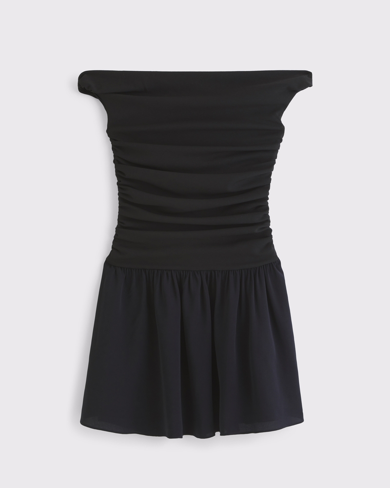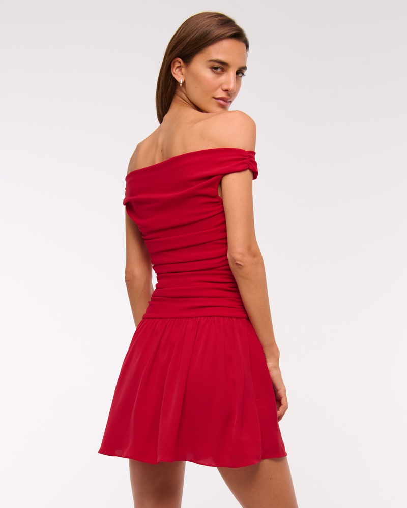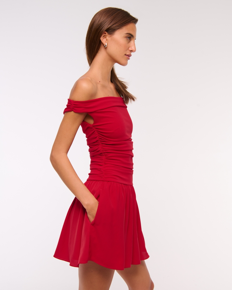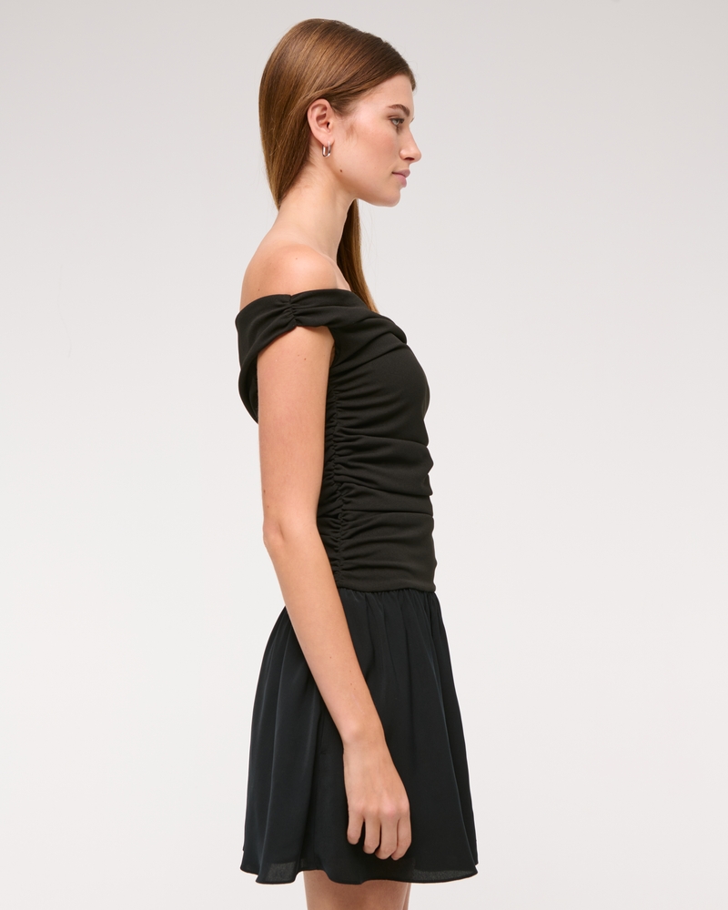 Flattering mini dress in our mixed jersey crepe & drapey faux silk fabric, featuring off-the-shoulder detail, dropped waistline, flattering ruching details along the bodice and a flirty skirt.