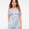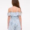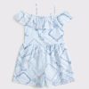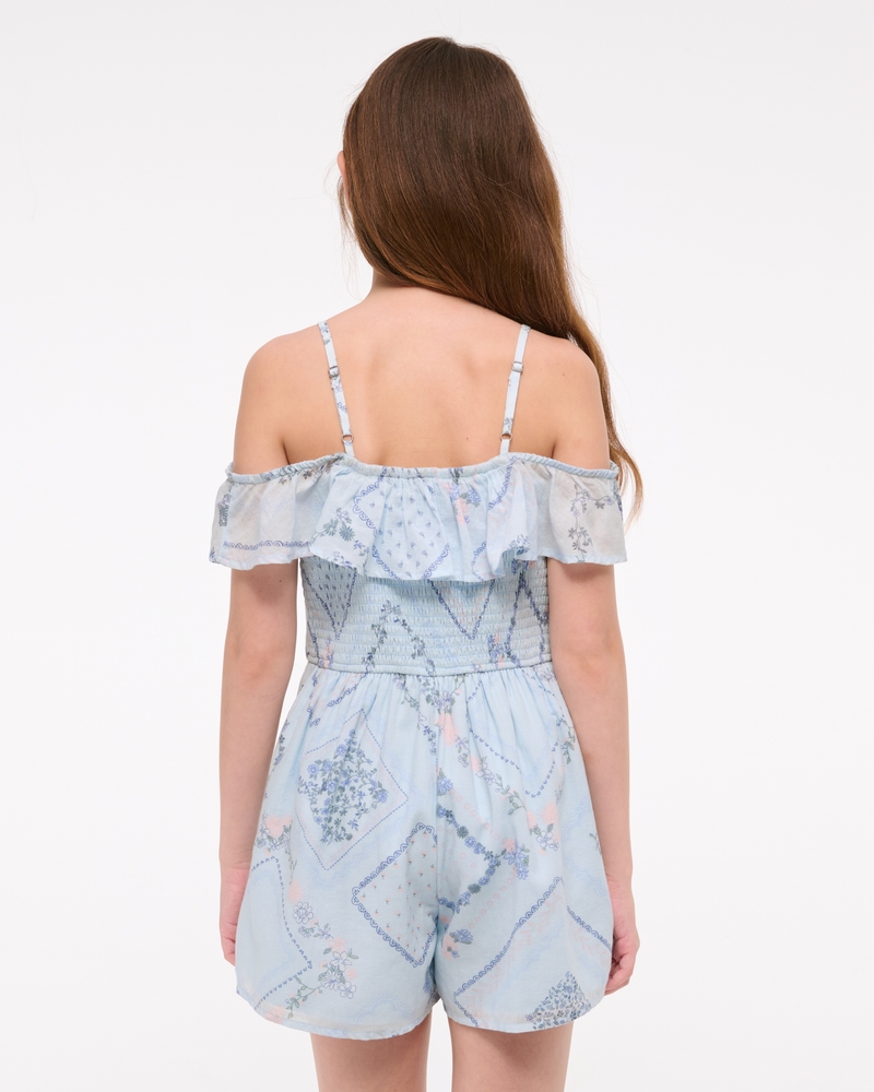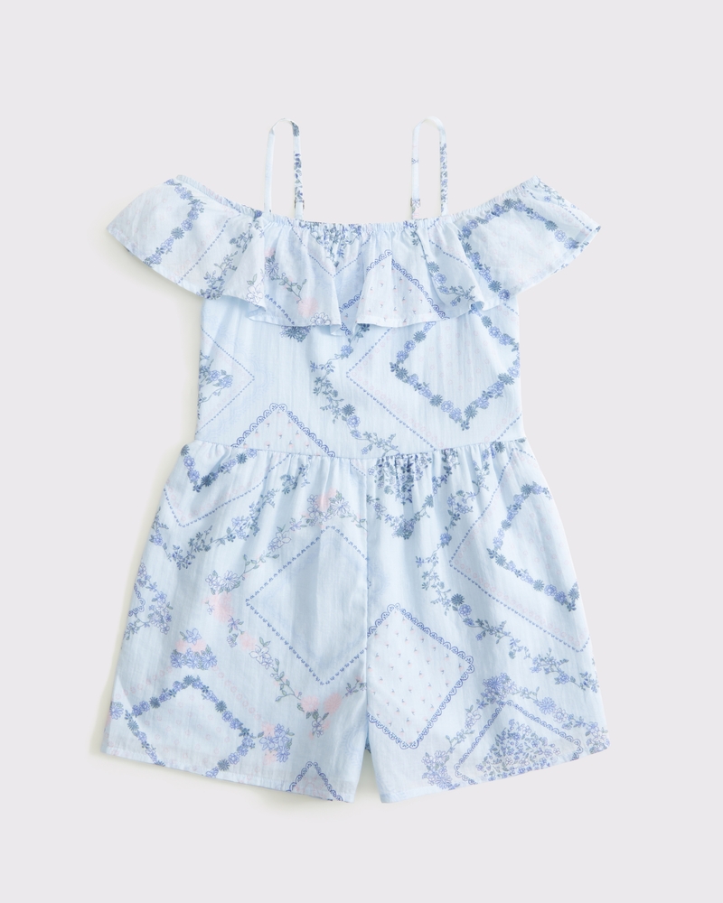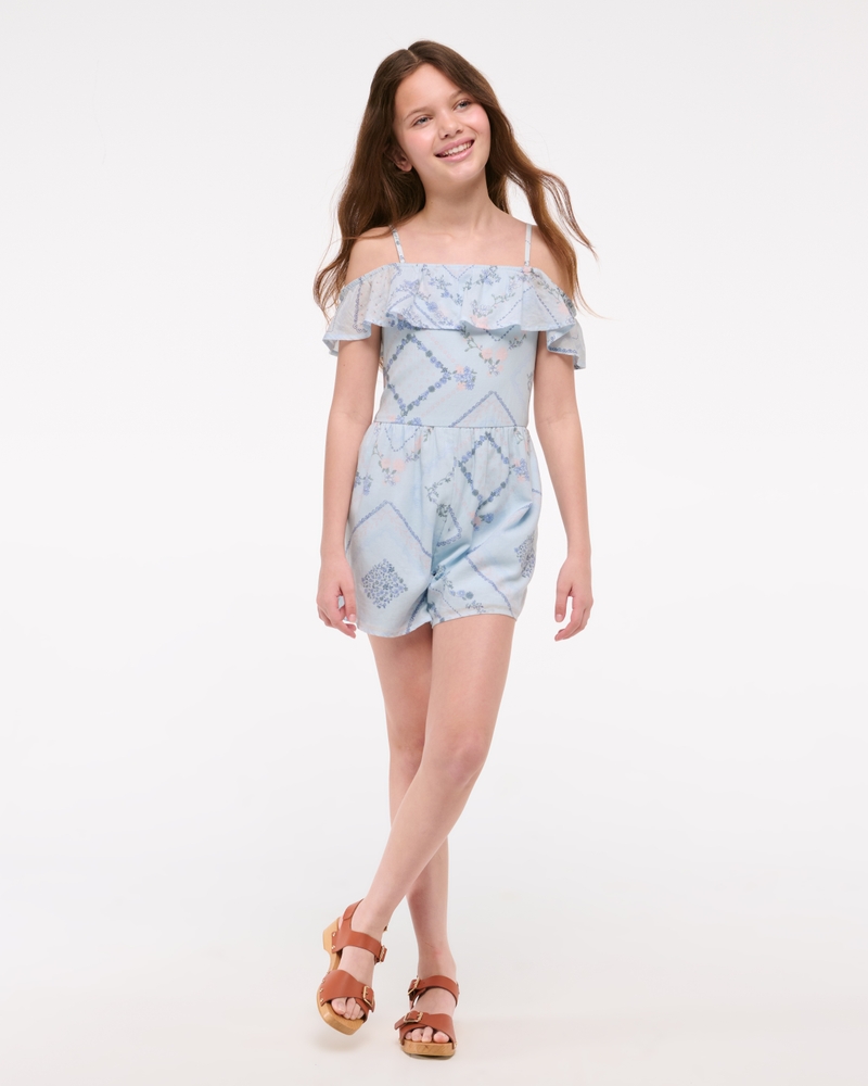 Versatile romper in a soft cotton fabric, featuring off-the-shoulder detail with adjustable straps, on-trend ruffle detail at the neckline and pockets. Imported.