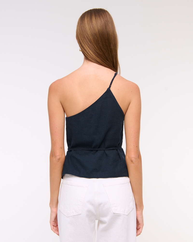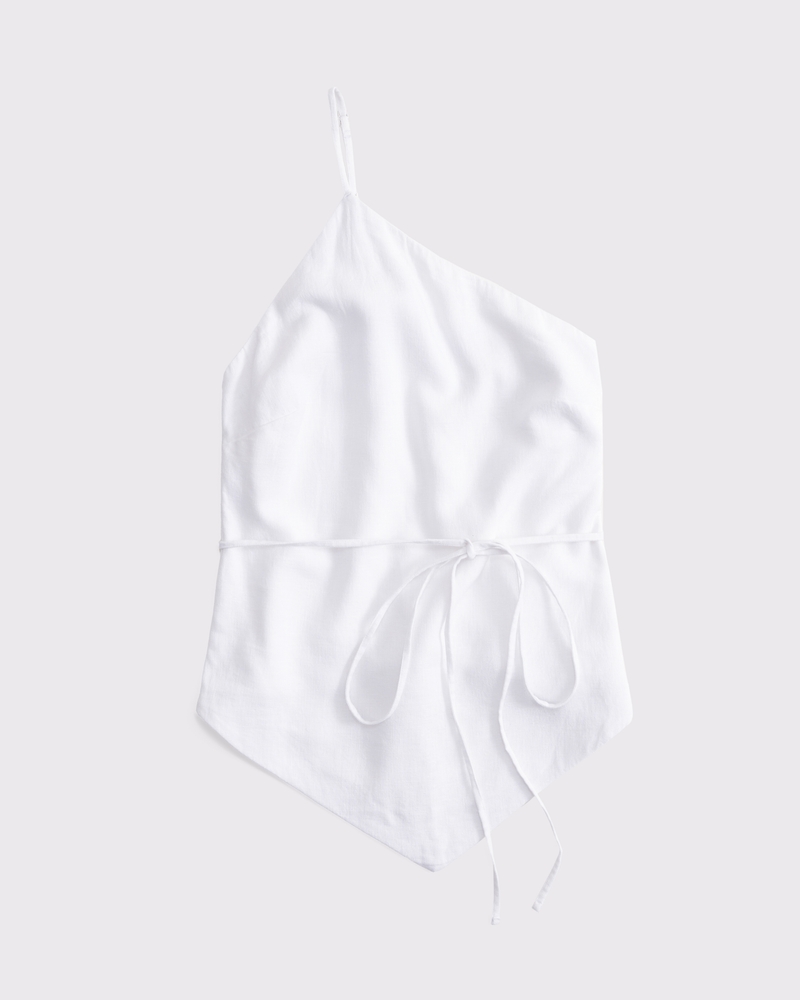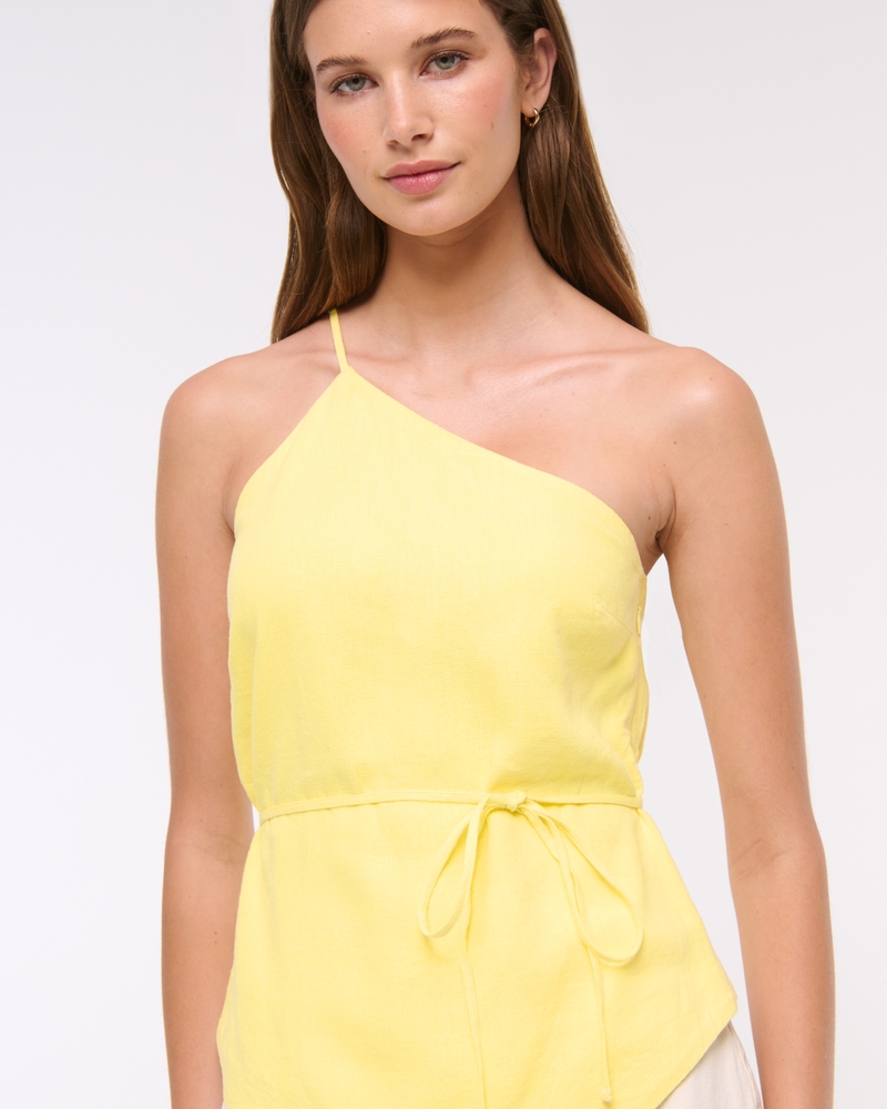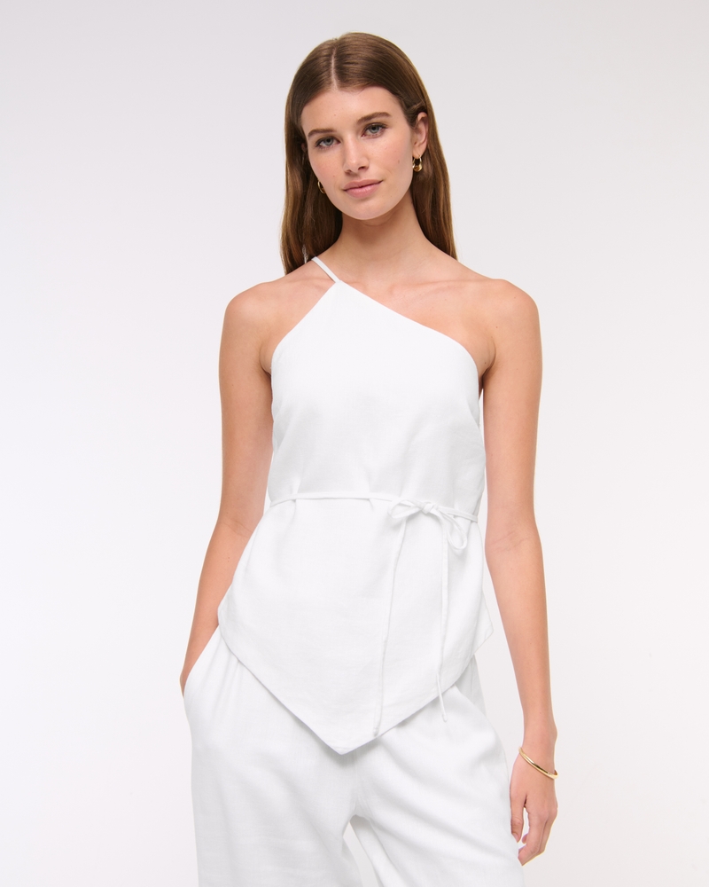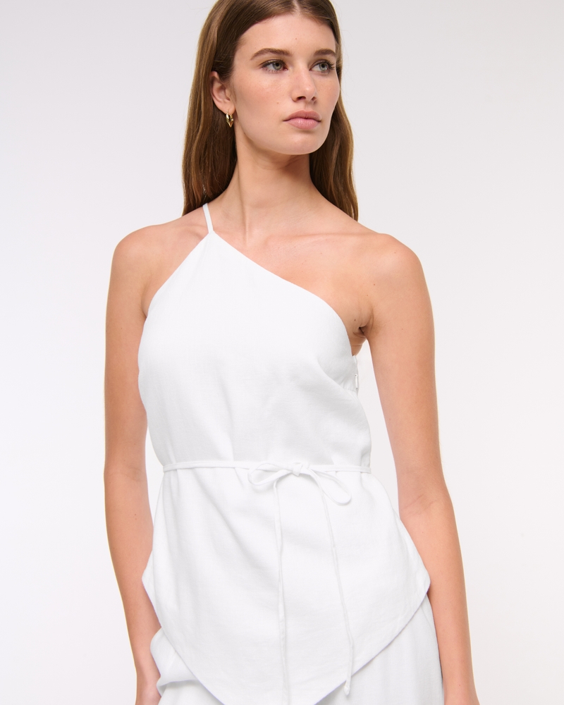 Flattering one-shoulder top in our soft linen-blend fabric, featuring adjustable tie details at the waist, asymmetrical neckline and on-trend pointed hem. Imported.