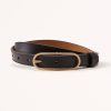 Versatile 100% genuine leather belt, with elevated gold hardware that features a sleek oval buckle and twin belt loops. Belt strap width: 0.75 in. Buckle length: 3 in. Buckle width: 0.75 in. Imported.