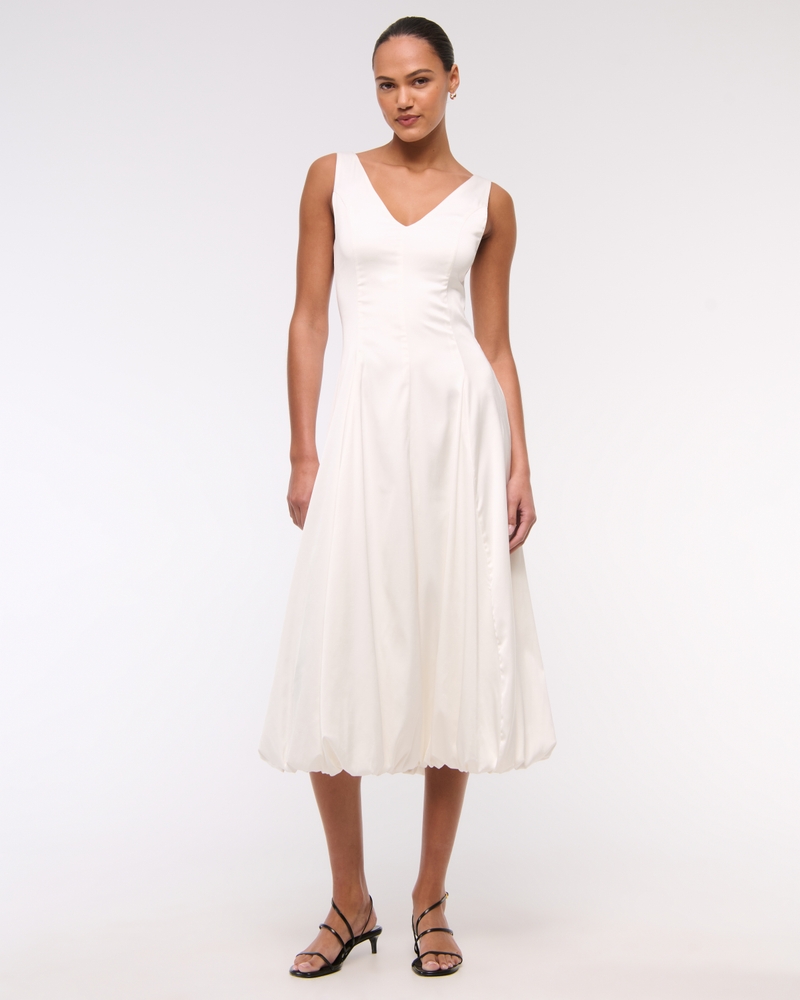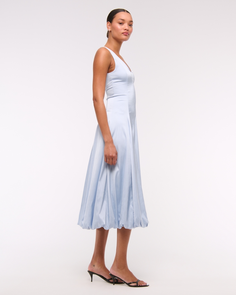 Flattering midi dress in our stretchy satin fabric, featuring a plunging v-neckline, corset-style seaming details along the bodice and on-trend bubble hem. Imported.