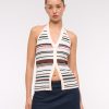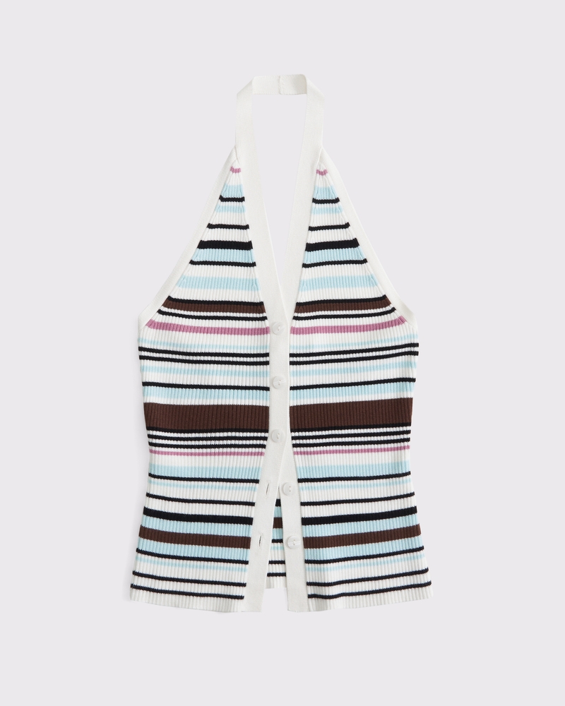 Slim-fitting vest in our sculpting sweater-knit fabric, featuring a trend-forward halter neckline and open back, button-through detail and ribbed stitching details throughout. Pairs perfect with jeans or a mini skirt!