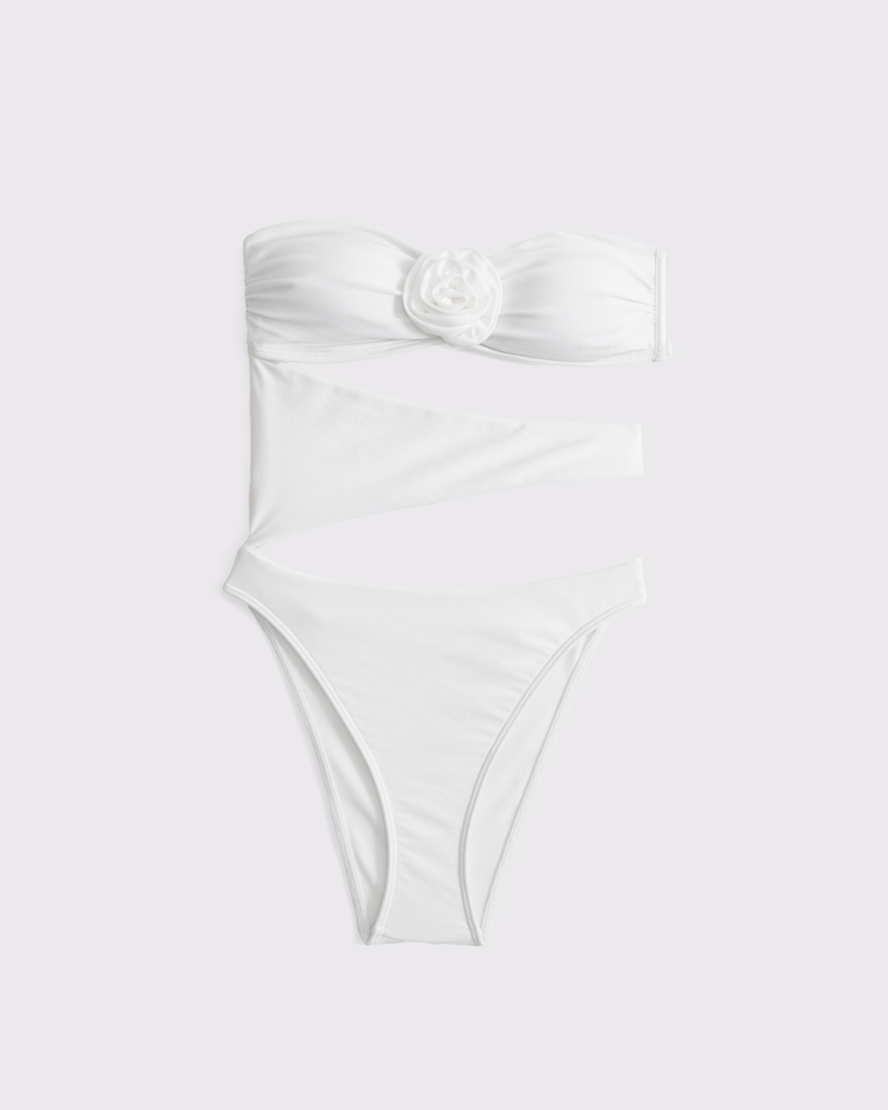 Our new one-piece swimsuit in our core shine swim fabric and moderate coverage, featuring a flattering high-leg cut, rosette detail at the center, cutout details at the waist, removable straps and removable pads. Imported.
