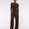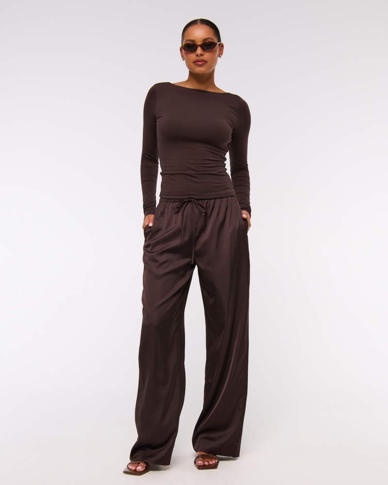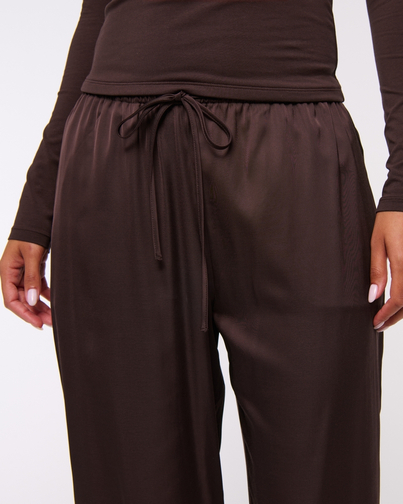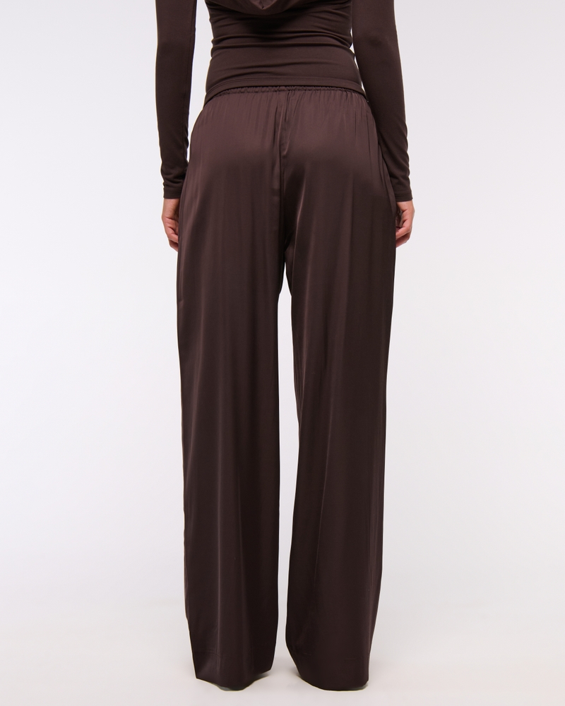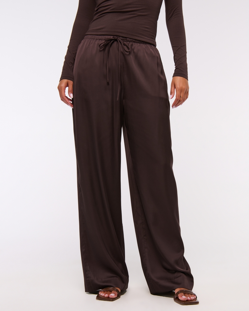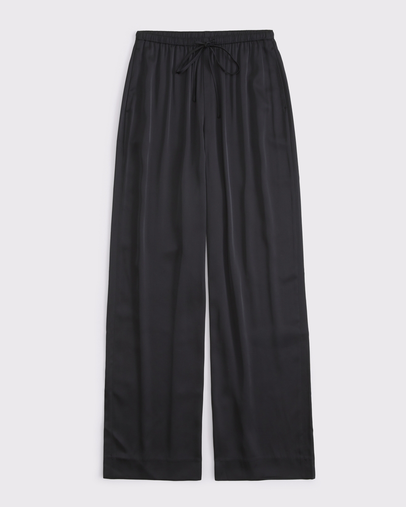 Wide leg pants in a soft satin fabric, featuring a pull-on style elasticated waistband with a drawcord detail for comfort and an adjustable rise. Imported.