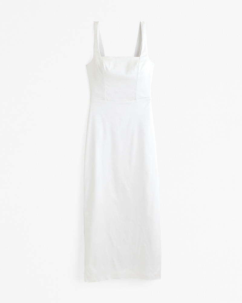 Flattering midi dress in our sculpting stretch-enhanced satin fabric, featuring wide straps, clean column skirt, thigh-high side slit detail and center back zipper closure. Imported.