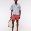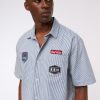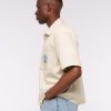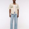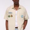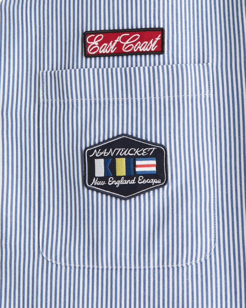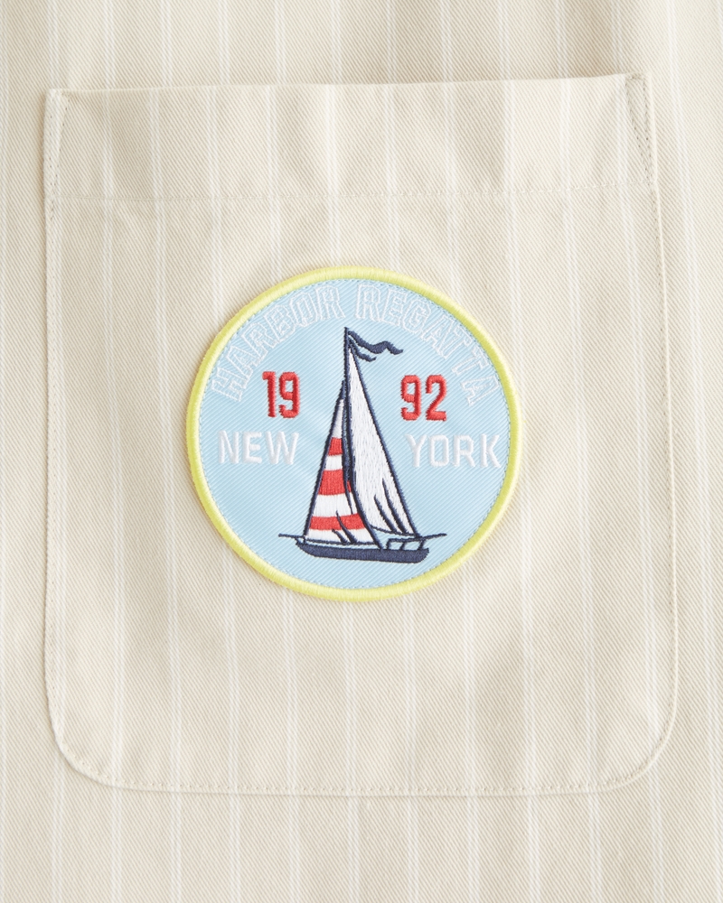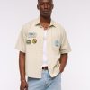 Comfortable short-sleeve button-up shirt in our drapey twill fabric and new cropped length. Features a relaxed-fit silhouette, classic collar, embroidered patchwork-inspired graphic details, left chest pocket and curved hem. Imported.