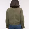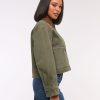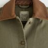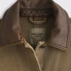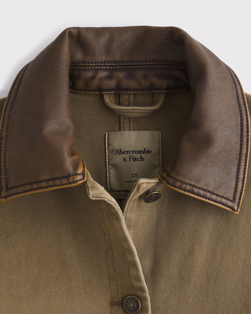 Our new on-trend barn jacket in a lightweight twill fabric, featuring a vegan leather collar detail, front pockets and a button-up front. This jacket features an easier fit, size down for a closer fit! Imported.
