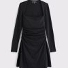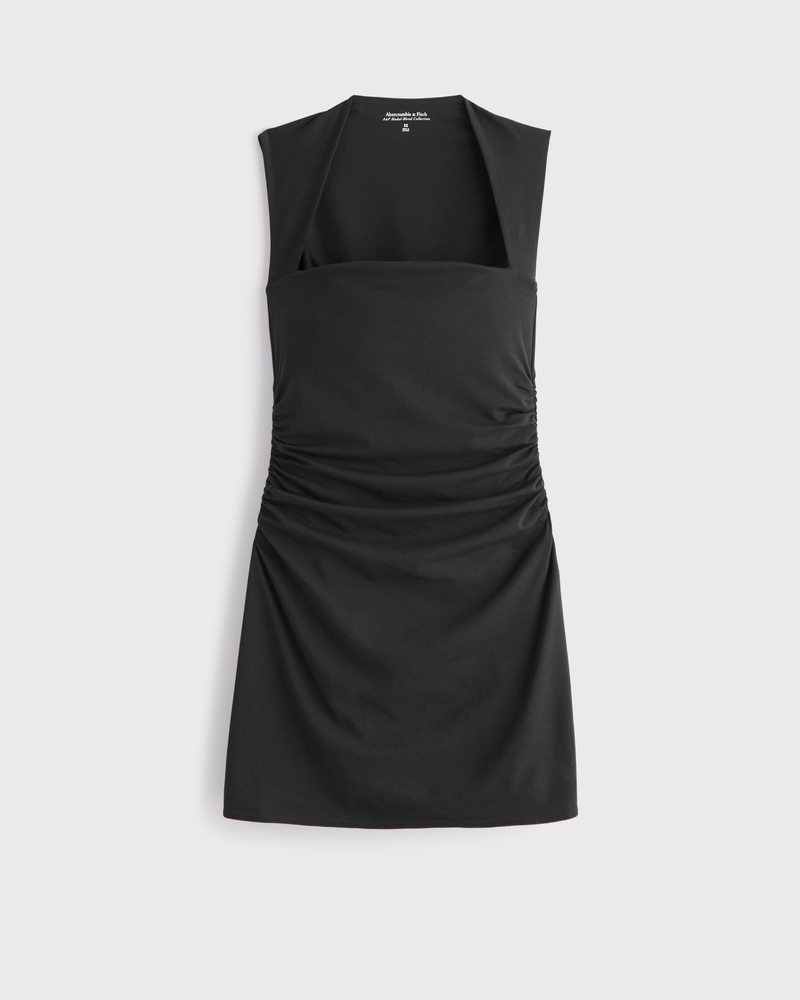 Slim-fitting mini dress in our ultra soft and flattering cotton-blend fabric, featuring ruching details along the bodice and a portrait neckline. Imported.