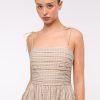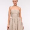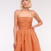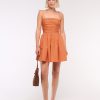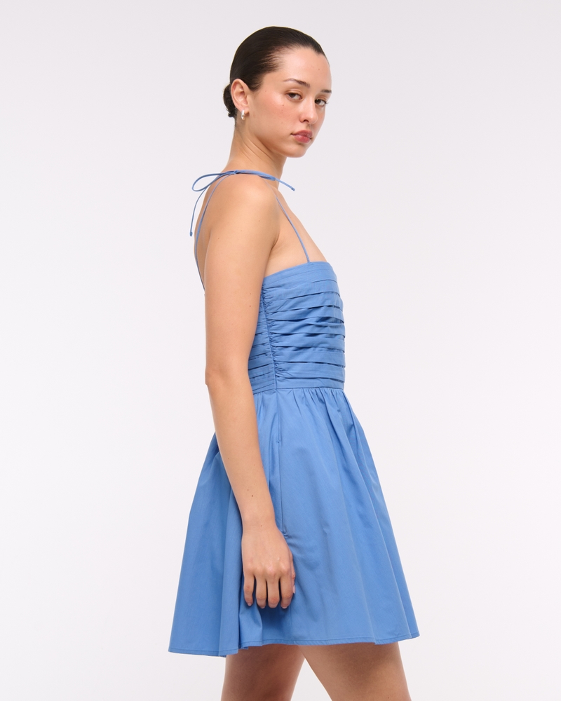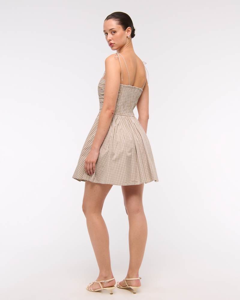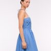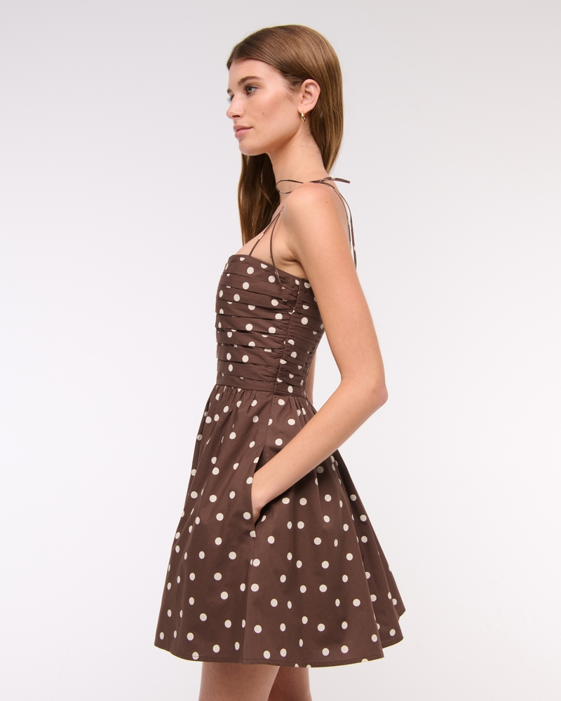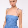 Flattering mini dress in our classic poplin fabric and waisted silhouette, featuring on-trend adjustable tie straps, ruching details along the bodice, volume skirt with pockets and square neckline. Imported.