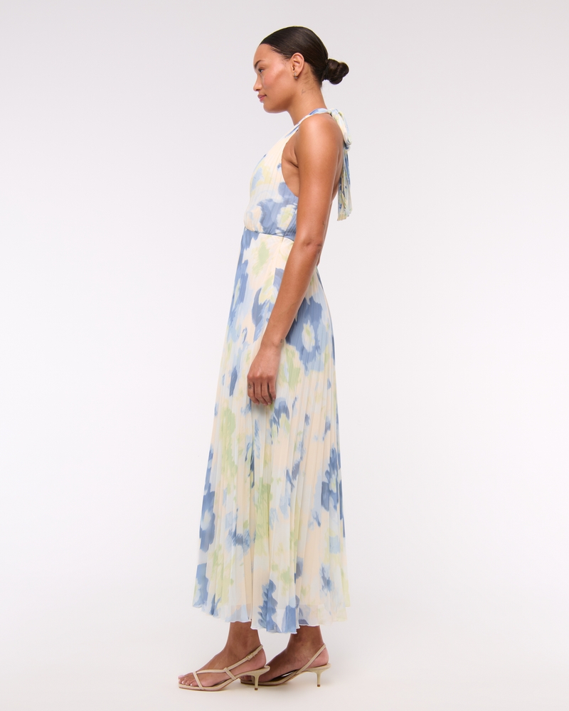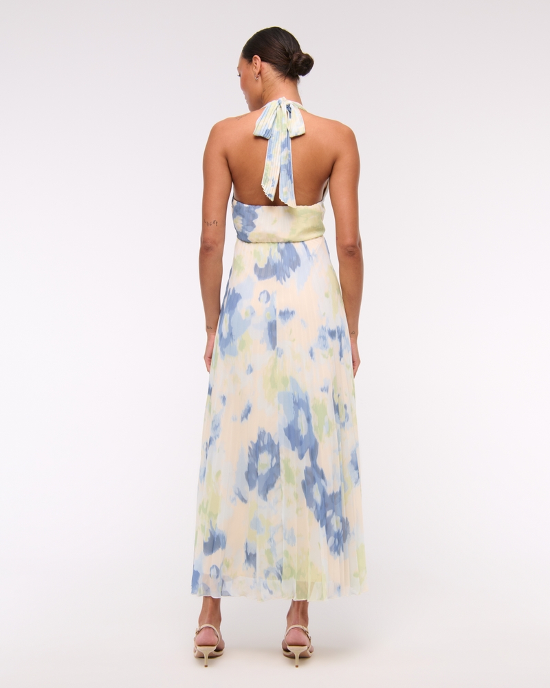 Flattering maxi dress in our ultra sheer crepe fabric, featuring all-over pleating details and a plunging halter neckline with adjustable ties for the perfect fit.