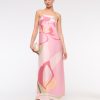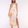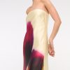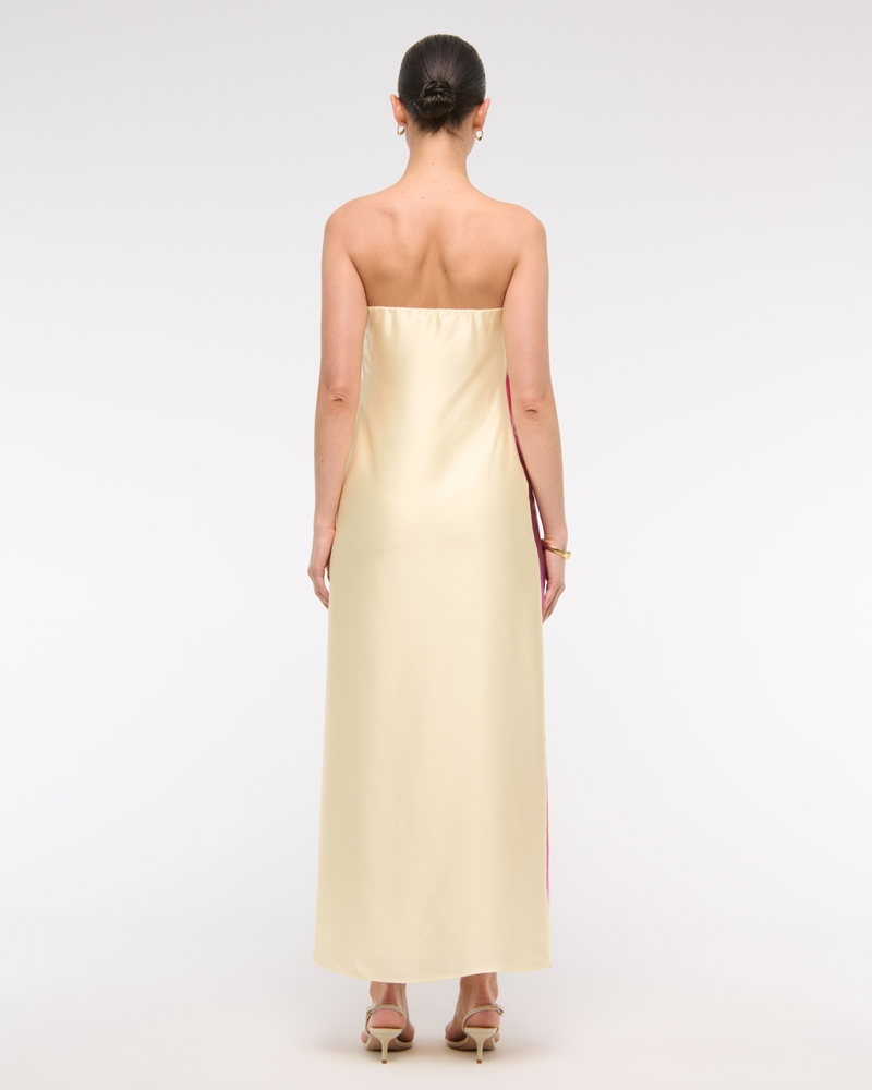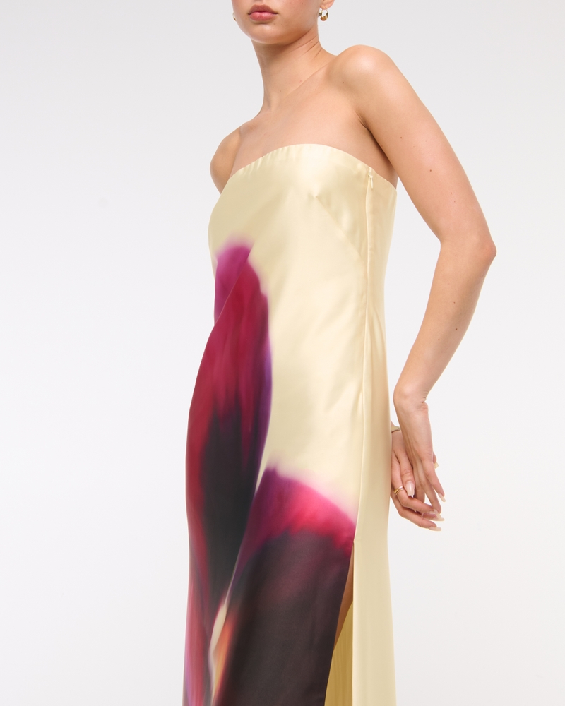 Flattering strapless maxi slip dress in our silky soft satin fabric with thigh-high slit detail. Imported.