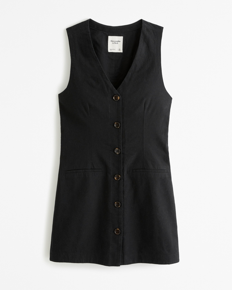 Our new vest mini dress in our soft linen-blend fabric, featuring button-through detail, non-functional front pockets and v-neckline. Imported.