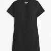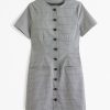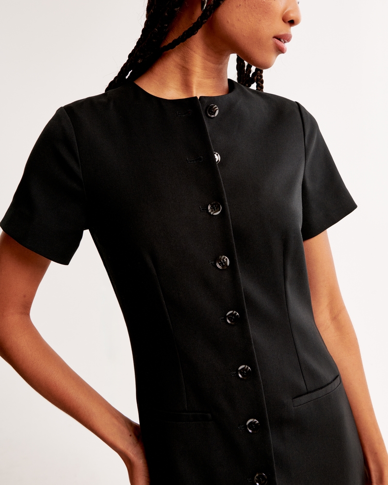 Flattering short-sleeve mini dress in our menswear suiting fabric and body-skimming fit, featuring functional button-through detail, trendy high-neck detail and front pocket detail. Imported.