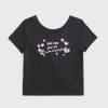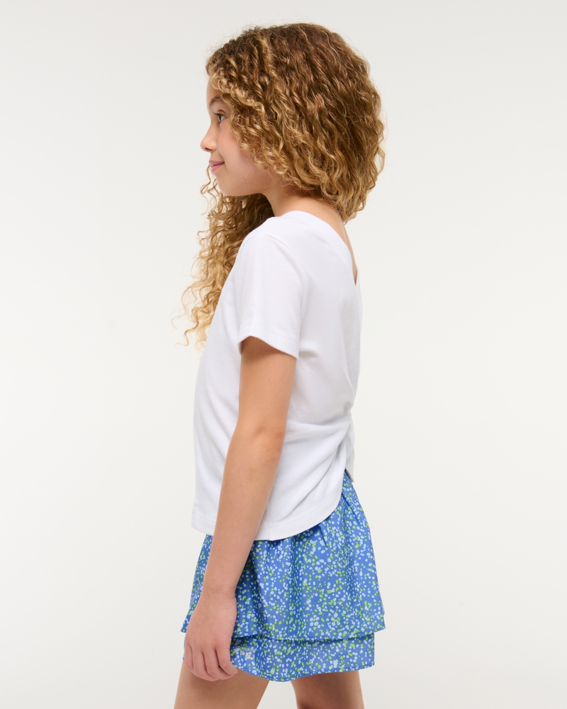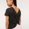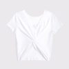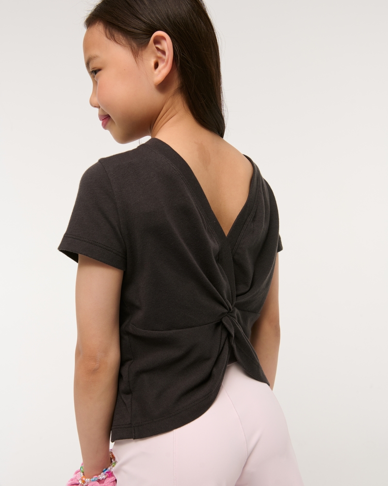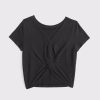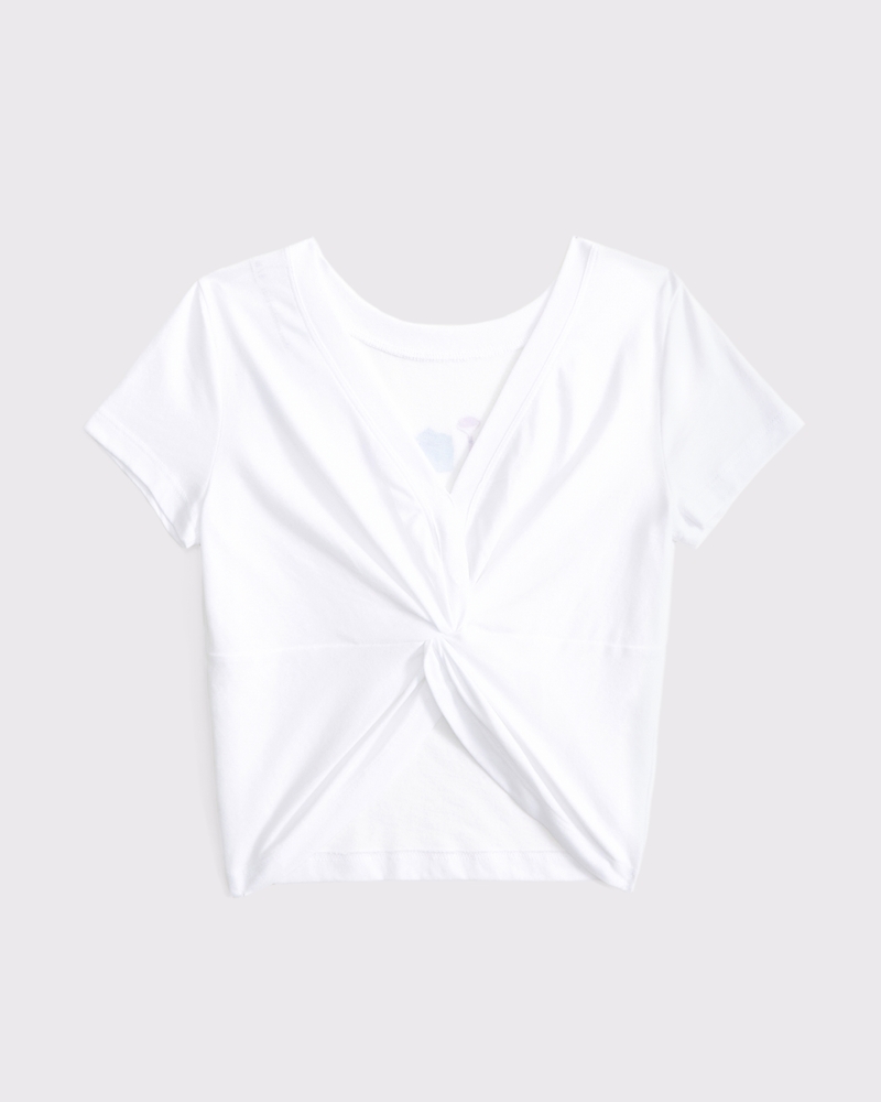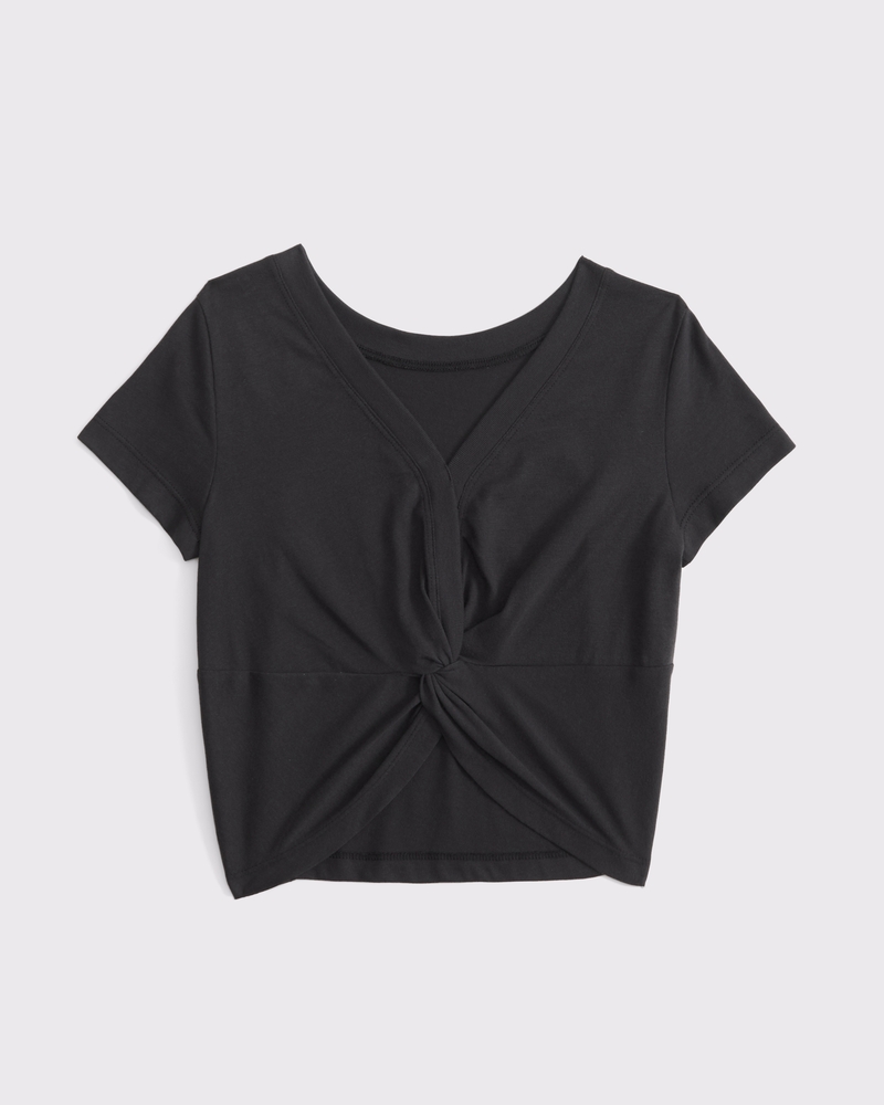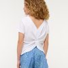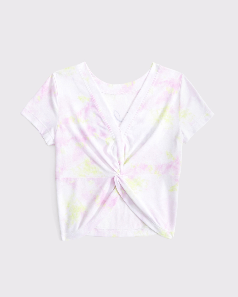 Comfortable short-sleeve tee in our soft jersey fabric and medium length, that hits right at the hips, featuring graphic detail at chest, on-trend twist-back detail and crew neckline. Imported.
