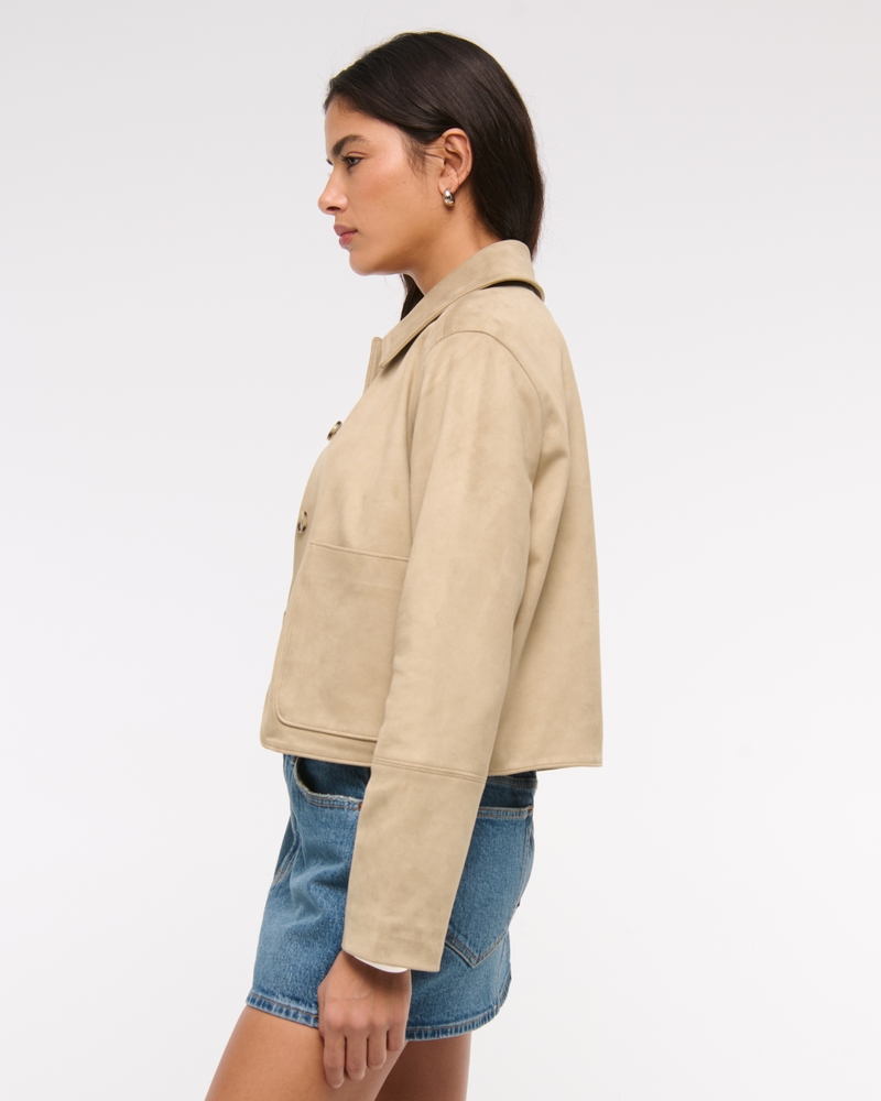 Our new on-trend short jacket in our vegan suede fabric, featuring a classic fold-down collar, button-up front and front pockets. Imported.