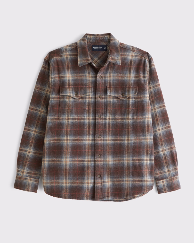 On-trend long-sleeve button-up shirt in a soft flannel fabric and relaxed-fit silhouette, featuring chest pockets with button flap closure and curved hem. Imported.