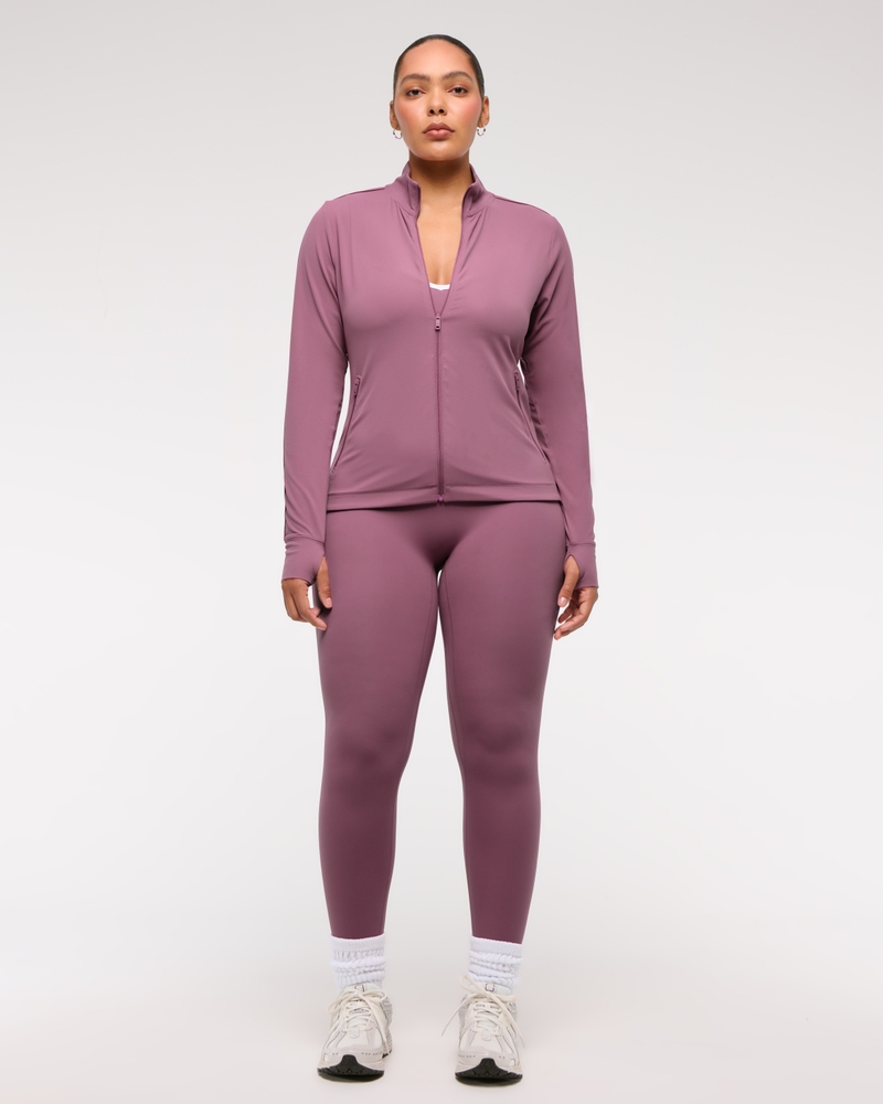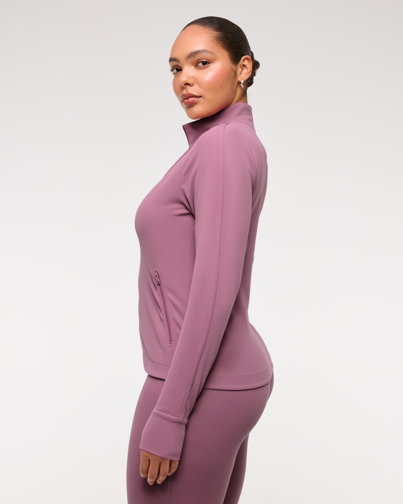 Our new full-zip active layer in our comfortable studioFLEX active fabric, that’s perfect for throwing on pre- and post-workout! Our studioFLEX fabric is lightweight, buttery soft and nonrestrictive providing a barely there feel, it moves with you during low impact activity and is also great for all-day wear. Features a slim fit, zip-up front, mockneck collar, side pockets and thumbholes at cuffs. Pairs perfect with our YPB slim tanks! Imported.